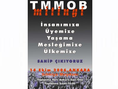 Türk Mühendis ve Mimar Odaları Birliği Ankara İl Koordinasyon Kurulu, 14 Ekim TMMOB Mitingi hazırlıkları kapsamında 11 Ekim 2006 Çarşamba günü Sakarya Caddesi’nden Yüksel Caddesi’ne insan zinciri oluşturarak, bildiri dağıtımı ve Yüksel Caddesi’nde basın açıklaması yapacak.