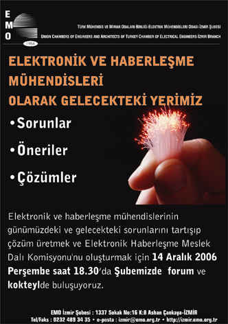 Elektronik ve haberleşme mühendislerinin günümüzdeki ve gelecekteki sorunlarını tartışıp çözüm üretmek ve Elektronik Haberleşme Meslek Dalı Komisyonu‘nu oluşturmak için 14 Aralık 2006 Perşembe saat 18.30‘da Şubemizde forum ve kokteylde buluşuyoruz.