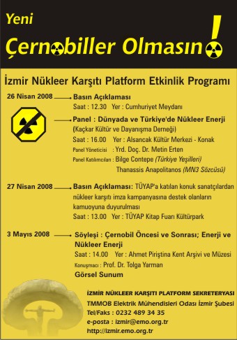 Basın Açıklaması Saat : 12.30 Yer : Cumhuriyet MeydanıPanel : Dünyada ve Türkiye‘de Nükleer Enerji (Kaçkar Kültür ve Dayanışma Derneği) Saat : 16.00 Yer : Alsancak Kültür Merkezi - Konak Panel Yöneticisi : Yrd. Doç. Dr. Metin Erten Panel Katılımcıları : Bilge Contepe (Türkiye Yeşilleri) Thanassis Anapolitanos (MN3 Sözcüsü)