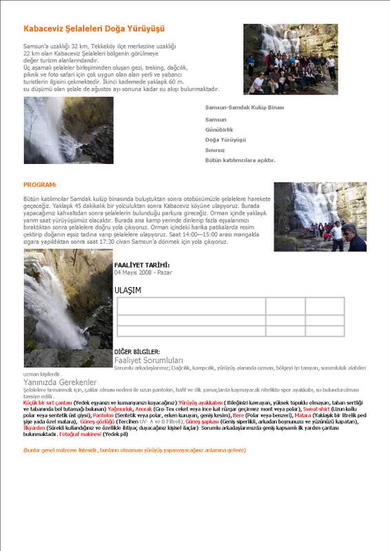 Şubemiz tarafından Samsun‘a uzaklığı 32 km, Tekkeköy ilçe merkezine uzaklığı 22 km olan Kabaceviz Şelaleleri‘ne 4 Mayıs 2008 Pazar günü doğa yürüyüşü düzenlenecektir.