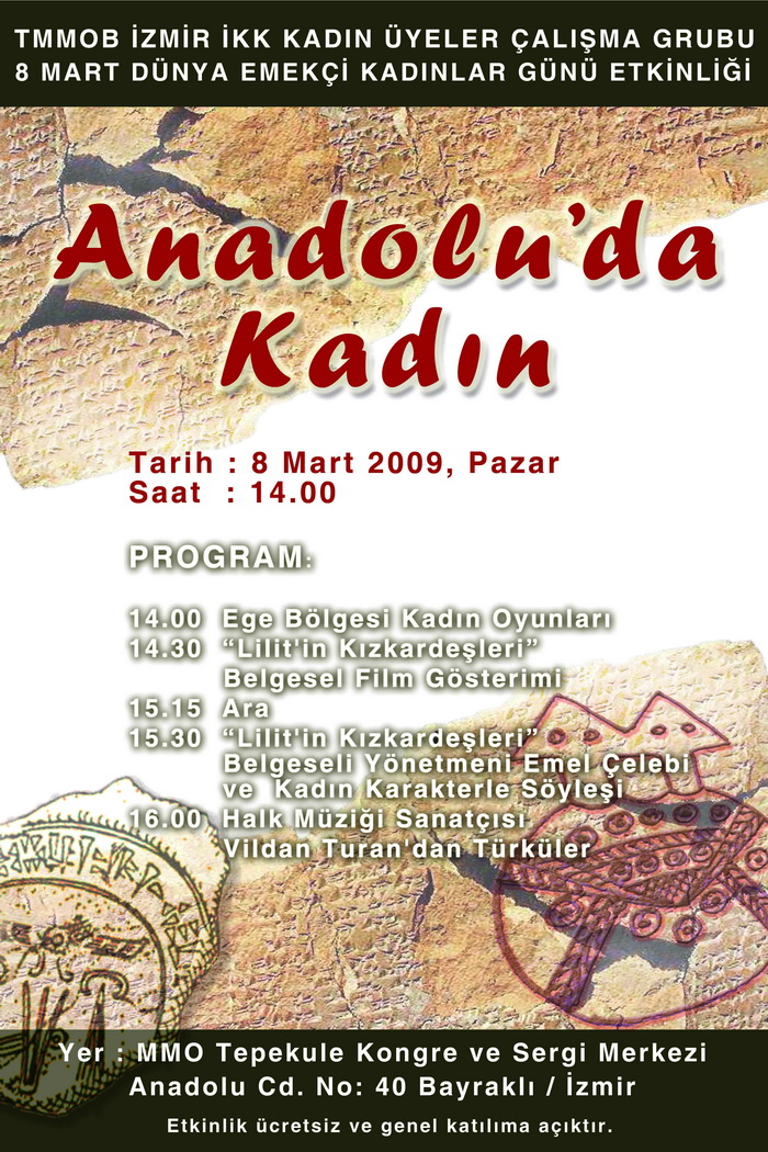 TMMOB İzmir İl Koordinasyon Kurulu Kadın Üyeler Çalışma Grubu, kadınların hakları için verdikleri mücadelede en önemli gün olan 8 Mart‘ı tüm İzmirlilerle birlikte kutlamak için bir program hazırladı. MMO Tepekule Kongre ve Sergi Merkezi Anadolu Salonunda 8 Mart 2009, Pazar günü saat 14.00‘te başlayacak programda film gösterimi, söyleşi ve halk müziği konseri yer alacak. Etkinlikte, yönetmen Emel Çelebi‘nin geçen yıl gösterime giren ilk filmi "Lilit‘in Kızkardeşleri" belgeseli gösterilecek. Belgeselde, Kibele‘den bugüne ulaşmış Anadolu kadın kültürünün izi sürülüyor. Bu kültür günümüzde hala Anadolu kadınlarının giysilerinde ve yaşama biçiminde ifadesini buluyor. Emel Çelebi, belgeselinde kahramanlarını doğal yaşam ortamlarında yalın bir sinema diliyle anlatıyor. Programda yönetmen Emel Çelebi ve yaşamları belgesele konu olan kadınlarla kısa bir söyleşi de gerçekleştirilecek. Etkinliğin ikinci bölümünde Makina Mühendisleri Odası İzmir Şubesi Halk Müziği Korosunun şefi, TRT Sanatçısı Vildan Turan, 8 Mart için seçtiği türkülerle mini bir konser sunacak. Kadın Üyeler Çalışma Grubu, 8 Mart etkinliğine tüm İzmirlileri davet ediyor. TMMOB İZMİR İKK KADIN ÜYELER ÇALIŞMA GRUBU 8 MART DÜNYA EMEKÇİ KADINLAR GÜNÜ ETKİNLİĞİ "ANADOLU‘DA KADIN" Tarih : 8 Mart 2009, Pazar Saat : 14.00 - 16.30 Yer : MMO Tepekule Kongre ve Sergi Merkezi - Anadolu Cd. No: 40 Bayraklı / İzmir PROGRAM : 14.00 Kadın Efelerden halk dansları 14.30 "Lilit‘in Kızkardeşleri" Belgesel Gösterimi 15.15 Ara 15.30 Söyleşi ("Lilit‘in Kızkardeşleri" Belgeseli Yönetmeni Emel Çelebi ve belgeselde yer alan üç kadın karakterle söyleşi) 16.00 Halk Müziği Sanatçısı Vildan Turan‘dan Türküler Üyelerimiz ve tüm İzmirliler davetlidir.