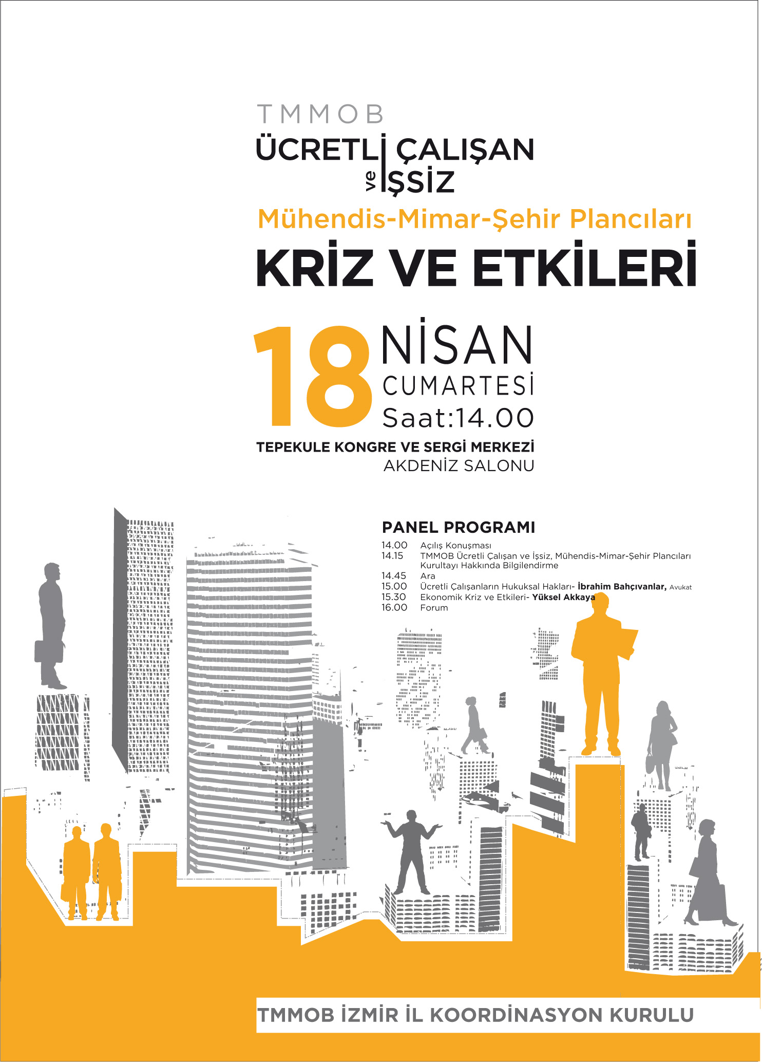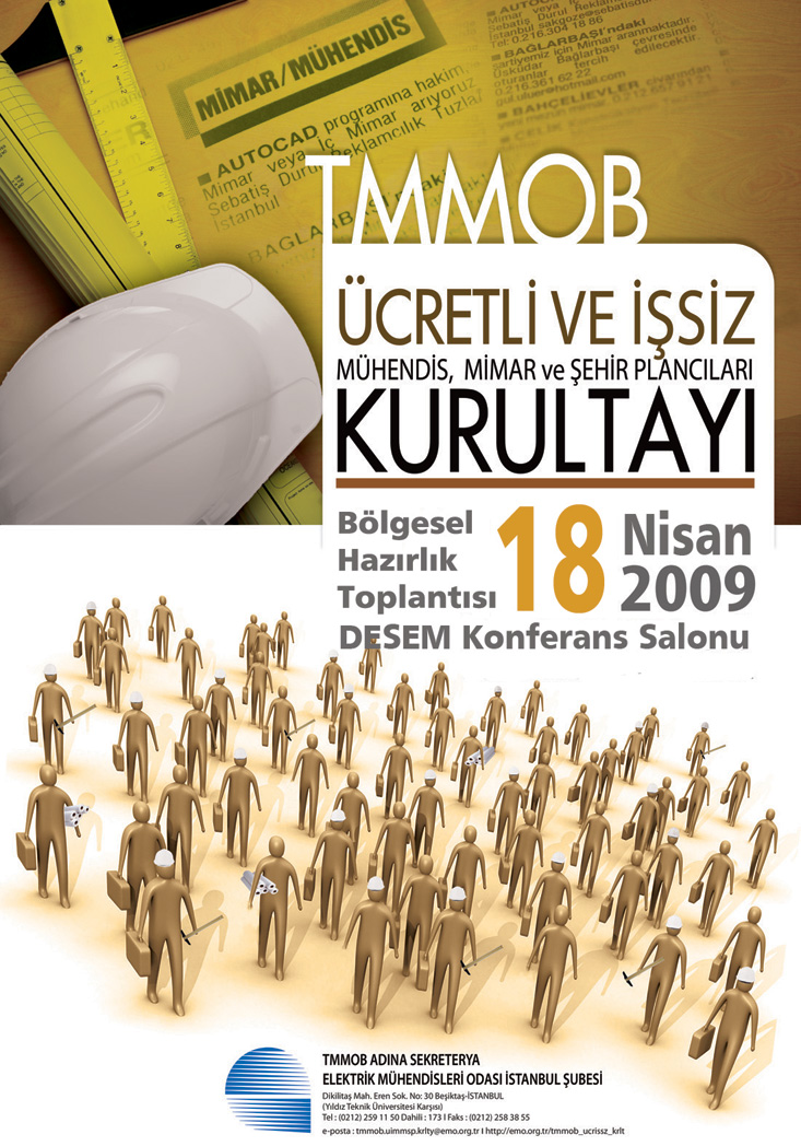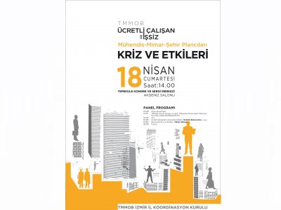 Ücretli ve işsiz mühendis, mimarların ve şehir plancılarının çalışma yaşamında karşılaştıkları sorunları ve nedenlerini belirlemek, özlük haklarını tartışmak ve çözüm üretmek , Kapitalizmin krizlerinin doğru algılanarak çözümleri tartışmak ve TMMOB örgütlülüğünü yaygınlaştırmak amacıyla TMMOB adına Elektrik Mühendisleri Odası İstanbul Şube yürütücülüğünde düzenlenecek " ÜCRETLİ VE İŞSİZ MÜHENDİS, MİMAR VE ŞEHİR PLANCILARI KURULTAYI" na, İzmir bölgesinden taşınacakları ortaya çıkarmak için 18 Nisan Cumartesi 14:00 de , Tepekule Kongre Merkezinde gerçekleşecek olan Kriz ve Etkileri Paneline tüm üyelerimizin katkı ve katılımını bekliyoruz. Program: 14:00 Açılış konuşması 14:15 Kurultay Hakkında Bilgilendirme 14:45 Ara 15:00 Ücretli Çalışanların Hukuksal Hakları , Av. İbrahim Bahçıvanlar 15:30 Ekonomik Kriz ve Etkileri Prof. Dr. Yüksel Akkaya 16:00 Forum