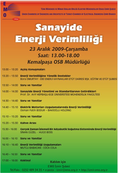 PROGRAM 13:00 - 13:20 Açılış Konuşmaları 13:20 - 13:50 Enerji Verimliliğine Yönelik Destekler Bora OMURTAY - ELEKTRİK İŞLERİ ETÜT İDARESİ 13:50 - 14:00 Soru Ve Yanıtlar 14:00 - 14:30 Sanayide Enerji Yönetimi ve Standartlarının Getirdikleri Prof. Dr. Arif HEPBAŞLI - EGE ÜNİVERSİTESİ 14:30 - 14:40 Soru Ve Yanıtlar 14:40 - 15:10 Elektrik Motorları Uygulamalarında Enerji Verimliliği Osman Fatih BODUR - BAKİOĞLU HOLDİNG 15:10 - 15:20 Soru Ve Yanıtlar 15:20 - 15:30 Kahve Arası 15:30 - 16:00 Gerçek Zaman İzlemeli Bir Adyabatik Soğutma Sisteminde EnerjiVerimliliği Sinan GÜZEL - HUGO BOSS 16:00 - 16:10 Soru Ve Yanıtlar 16:10 - 16:40 Enerji Verimliliği Uygulamaları Mutlu BABACAN - COCA-COLA 16:40 - 16:50 Soru Ve Yanıtlar 17:00 - 18:00 Kokteyl