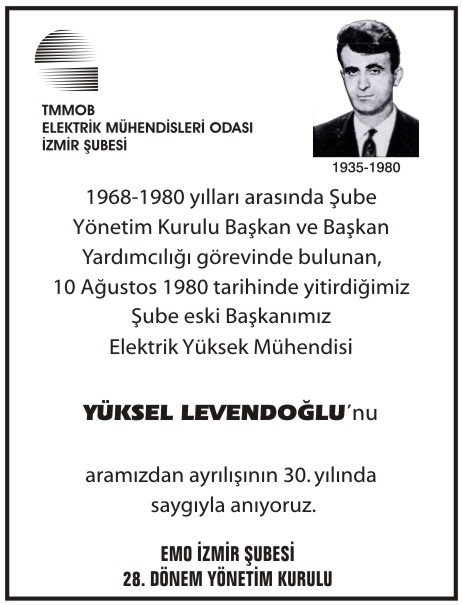 Yüksel Levendoğlu : 1935 yılında İzmit‘te doğdu. İlk ve orta eğitimini İzmir‘de tamamladıktan sonra, 1962 yılında İTÜ Elektrik Fakültesi‘ni elektrik yüksek mühendisi ünvanı ile bitirdi. Askerlik görevine kadar kısa bir süre özel bir firmada müşavir mühendis olarak çalıştı. 1965 yılında girdiği Manisa Bayındırlık Müdürlüğü‘nde kontrol mühendisi olarak çalıştıktan sonra, son görev yeri olan Ege Üniversitesi‘nde 1967‘de başlayan görevi, Yapı İşleri Daire Başkan Yardımcısı olarak Kuşadası‘nda bir kalp krizi ile yaşama veda ettiği 10 Ağustos 1980 tarihine kadar devam etti. EMO İzmir Şubesi‘nin 1. Döneminde Yönetim Kurulu Üyesi olarak başlayan Oda çalışmalarında; 2., 3., 4., 5., 8., 9., 10., 11. dönemlerde Başkan Yardımcısı, 6. ve 7. dönemlerde Yazman Üye, 12. ve 13. dönemlerde ölümüne değin Yönetim Kurulu başkanı olarak görev üstlenmiştir.