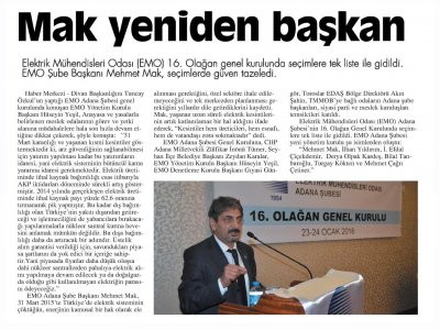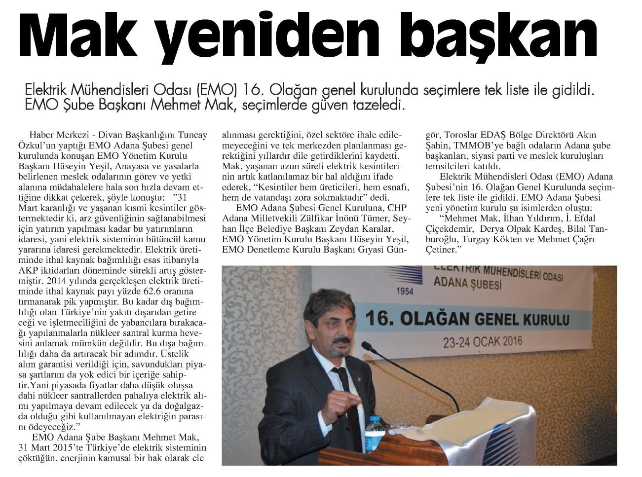 Elektrik Mühendisleri Odası (EMO) 16. Olağan Genel Kurulu‘nda seçimlere tek liste ile gidildi. EMO Şube Başkanı Mehmet Mak, seçimlerde güven tazeledi. Divan Başkanlığını Tuncay Özkul‘un yaptığı EMO Adana Şubesi Genel Kurulu‘nda konuşan EMO Yönetim Kurulu Başkanı Hüseyin Yeşil, Anayasa ve yasalarla belirlenen meslek odalarının görev ve yetki alanına müdahalelere hala son hızla devam ettiğine dikkat çekerek, şöyle konuştu: "31 Mart karanlığı ve yaşanan kısmi kesintiler göstermektedir ki, arz güvenliğinin sağlanabilmesi için yatırım yapılması kadar bu yatırımların idaresi, yani elektrik sisteminin bütüncül kamu yararına idaresi gerekmektedir. Elektrik üretiminde ithal kaynak bağımlılığı esas itibarıyla AKP iktidarları döneminde sürekli artış göstermiştir. 2014 yılında gerçekleşen elektrik üretiminde ithal kaynak payı yüzde 62.6 oranına tırmanarak pik yapmıştır. Bu kadar dış bağımlılığı olan Türkiye‘nin yakıtı dışarıdan getireceği ve işletmeciliğini de yabancılara bırakacağı yapılanmalarla nükleer santral kurma hevesini anlamak mümkün değildir. Bu dışa bağımlılığı daha da artıracak bir adımdır. Üstelik alım garantisi verildiği için, savundukları piyasa şartlarını da yok edici bir içeriğe sahiptir. Yani piyasada fiyatlar daha düşük oluşsa dahi nükleer santrallardan pahalıya elektrik alımı yapılmaya devam edilecek ya da doğalgazda olduğu gibi kullanılmayan elektriğin parasını ödeyeceğiz." EMO Adana Şube Başkanı Mehmet Mak, 31 Mart 2015‘te Türkiye‘ de elektrik sisteminin çöktüğün, enerjinin kamusal bir hak olarak ele alınması gerektiğini, özel sektöre ihale edilemeyeceğini ve tek merkezden planlanması gerektiğini yıllardır dile getirdiklerini kaydetti. Mak, yaşanan uzun süreli elektrik kesintilerinin artık katlanılamaz bir hal aldığını ifade ederek, "Kesintiler hem üreticileri, hem esnafı, hem de vatandaşı zora sokmaktadır" dedi. EMO Adana Şubesi Genel Kurulu‘na, CHP Adana Milletvekili Zülfikar inönü Tümer, Seyhan ilçe Belediye Başkanı Zeydan Karalar, EMO Yönetim Kurulu Başkanı Hüseyin Yeşil, EMO Denetleme Kurulu Başkanı Gıyasi Güngör, Toroslar EDAŞ Bölge Direktörü Akın Şahin, TMMOB‘ye bağlı odaların Adana şube başkanları, siyasi parti ve meslek kuruluşları temsilcileri katıldı. EMO Adana Şubesi‘nin 16. Olağan Genel Kurulunda seçimlere tek liste ile gidildi. EMO Adana Şubesi yeni yönetim kurulu şu isimlerden oluştu: "Mehmet Mak, ilhan Yıldırım, İ. Efdal Çiçekdemir, Derya Olpak Kardeş, Bilal Tanburoğlu, Turgay Kökten ve Mehmet Çağrı Çetiner." (5 Ocak; 26.02.2016)