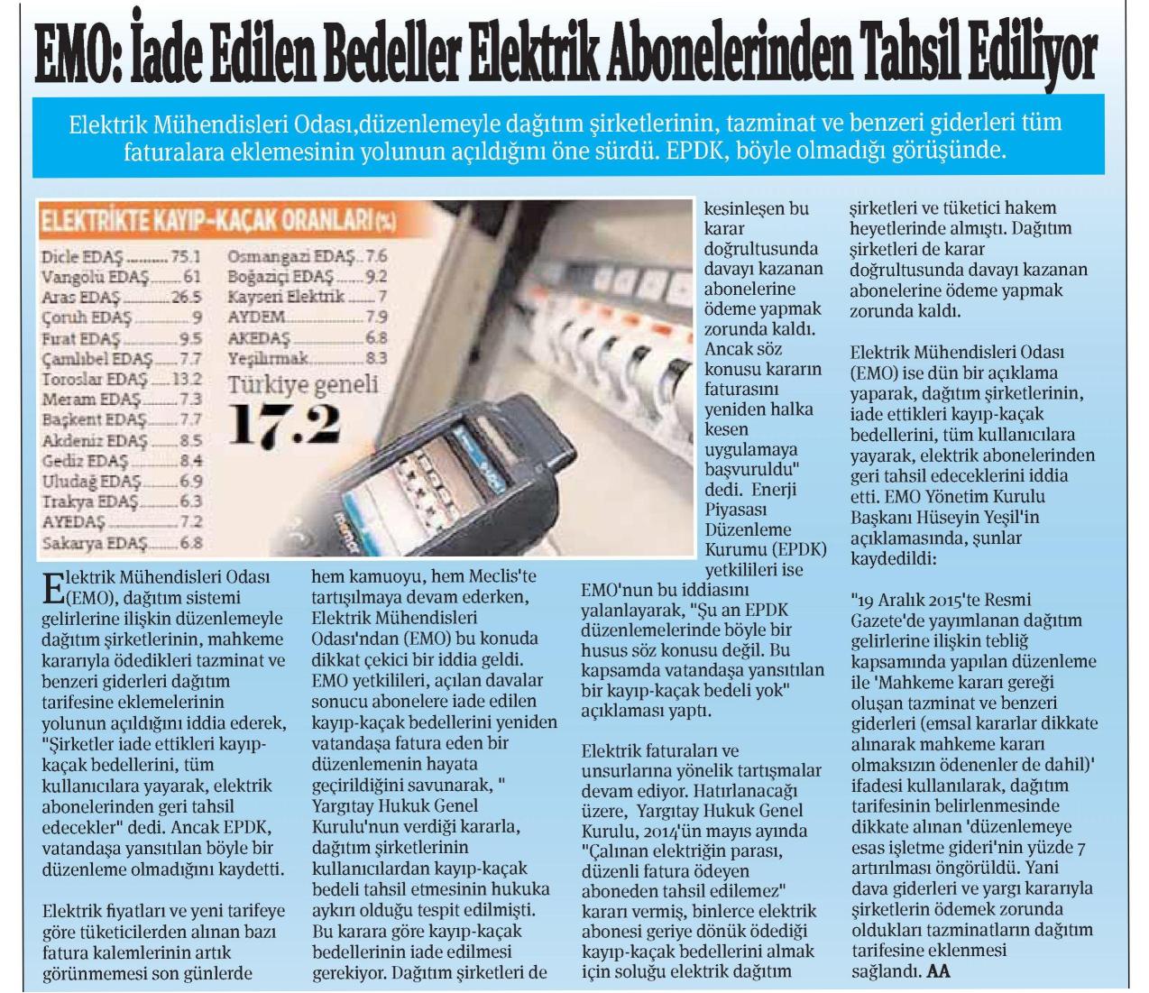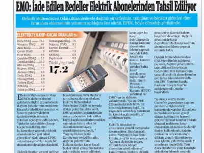 Elektrik Mühendisleri Odası,düzenlemeyle dağıtım şirketlerinin, tazminat ve benzeri giderleri tüm faturalara eklemesinin yolunun açıldığını öne sürdü. EPDK, böyle olmadığı görüşünde. Elektrik Mühendisleri Odası (EMO), dağıtım sistemi gelirlerine ilişkin düzenlemeyle dağıtım şirketlerinin, mahkeme kararıyla ödedikleri tazminat ve benzeri giderleri dağıtım tarifesine eklemelerinin yolunun açıldığını iddia ederek, "Şirketler iade ettikleri kayıpkaçak bedellerini, tüm kullanıcılara yayarak, elektrik abonelerinden geri tahsil edecekler" dedi. Ancak EPDK, vatandaşa yansıtılan böyle bir düzenleme olmadığını kaydetti. Elektrik fiyatları ve yeni tarifeye göre tüketicilerden alınan bazı fatura kalemlerinin artık görünmemesi son günlerde hem kamuoyu, hem Meclis‘te tartışılmaya devam ederken, Elektrik Mühendisleri Odası‘ndan (EMO) bu konuda dikkat çekici bir iddia geldi. EMO yetkilileri, açılan davalar sonucu abonelere iade edilen kayıp-kaçak bedellerini yeniden vatandaşa fatura eden bir düzenlemenin hayata geçirildiğini savunarak," Yargıtay Hukuk Genel Kurulu‘nun verdiği kararla, dağıtım şirketlerinin kullanıcılardan kayıp-kaçak bedeli tahsil etmesinin hukuka aykırı olduğu tespit edilmişti. Bu karara göre kayıp-kaçak bedellerinin iade edilmesi gerekiyor. Dağıtım şirketleri de kesinleşen bu karar doğrultusunda davayı kazanan abonelerine ödeme yapmak zorunda kaldı. Ancak söz konusu kararın faturasını yeniden halka kesen uygulamaya başvuruldu" dedi. Enerji Piyasası Düzenleme Kurumu (EPDK) yetkilileri ise EMO‘nun bu iddiasını yalanlayarak, "Şu an EPDK düzenlemelerinde böyle bir husus söz konusu değil. Bu kapsamda vatandaşa yansıtılan bir kayıp-kaçak bedeli yok" açıklaması yaptı. Elektrik faturaları ve unsurlarına yönelik tartışmalar devam ediyor. Hatırlanacağı üzere, Yargıtay Hukuk Genel Kurulu, 2014‘ün mayıs ayında "Çalınan elektriğin parası, düzenli fatura ödeyen aboneden tahsil edilemez" kararı vermiş, binlerce elektrik abonesi geriye dönük ödediği kayıp-kaçak bedellerini almak için soluğu elektrik dağıtım şirketleri ve tüketici hakem heyetlerinde almıştı. Dağıtım şirketleri de karar doğrultusunda davayı kazanan abonelerine ödeme yapmak zorunda kaldı. Elektrik Mühendisleri Odası (EMO) ise dün bir açıklama yaparak, dağıtım şirketlerinin, iade ettikleri kayıp-kaçak bedellerini, tüm kullanıcılara yayarak, elektrik abonelerinden geri tahsil edeceklerini iddia etti. EMO Yönetim Kurulu Başkanı Hüseyin Yeşil‘in açıklamasında, şunlar kaydedildi: "19 Aralık 2015‘te Resmi Gazete‘de yayımlanan dağıtım gelirlerine ilişkin tebliğ kapsamında yapılan düzenleme ile ‘Mahkeme kararı gereği oluşan tazminat ve benzeri giderleri (emsal kararlar dikkate alınarak mahkeme kararı olmaksızın ödenenler de dahil)‘ ifadesi kullanılarak, dağıtım tarifesinin belirlenmesinde dikkate alınan ‘düzenlemeye esas işletme gideri‘nin yüzde 7 artırılması öngörüldü. Yani dava giderleri ve yargı kararıyla şirketlerin ödemek zorunda oldukları tazminatların dağıtım tarifesine eklenmesi sağlandı. (Ekonomi; 02.03.2016)
