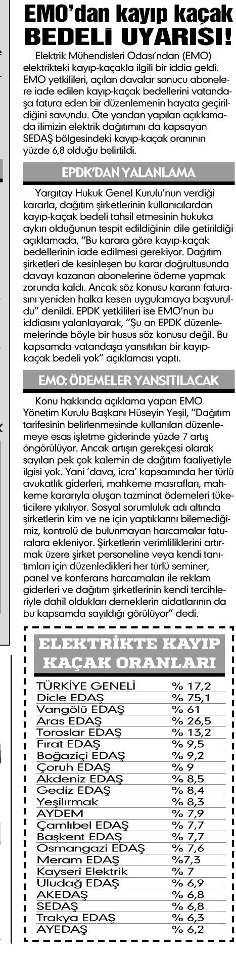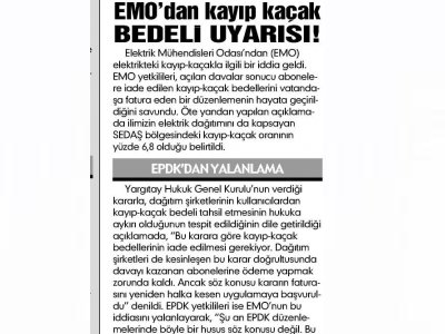 Elektrik Mühendisleri Odası‘ndan (EMO) elektrikteki kayıp-kaçakla ilgili bir iddia geldi. EMO yetkilileri, açılan davalar sonucu abonelere iade edilen kayıp-kaçak bedellerini vatandaşa fatura eden bir düzenlemenin hayata geçirildiğini savundu. Öte yandan yapılan açıklamada ilimizin elektrik dağıtımını da kapsayan SEDAŞ bölgesindeki kayıp-kaçak oranının yüzde 6,8 olduğu belirtildi. EPDK‘DAN YALANLAMA Yargıtay Hukuk Genel Kurulu‘nun verdiği kararla, dağıtım şirketlerinin kullanıcılardan kayıp-kaçak bedeli tahsil etmesinin hukuka aykırı olduğunun tespit edildiğinin dile getirildiği açıklamada, "Bu karara göre kayıp-kaçak bedellerinin iade edilmesi gerekiyor. Dağıtım şirketleri de kesinleşen bu karar doğrultusunda davayı kazanan abonelerine ödeme yapmak zorunda kaldı. Ancak söz konusu kararın faturasını yeniden halka kesen uygulamaya başvuruldu" denildi. EPDK yetkilileri ise EMO‘nun bu iddiasını yalanlayarak, "Şu an EPDK düzenlemelerinde böyle bir husus söz konusu değil. Bu kapsamda vatandaşa yansıtılan bir kayıpkaçak bedeli yok" açıklaması yaptı. EMO: ÖDEMELER YANSITILMAYACAK Konu hakkında açıklama yapan EMO Yönetim Kurulu Başkanı Hüseyin Yeşil, "Dağıtım tarifesinin belirlenmesinde kullanılan düzenlemeye esas işletme giderinde yüzde 7 artış öngörülüyor. Ancak artışın gerekçesi olarak sayılan pek çok kalemin de dağıtım faaliyetiyle ilgisi yok. Yani ‘dava, icra‘ kapsamında her türlü avukatlık giderleri, mahkeme masrafları, mahkeme kararıyla oluşan tazminat ödemeleri tüketicilere yıkılıyor. Sosyal sorumluluk adı altında şirketlerin kim ve ne için yaptıklarını bilemediğimiz, kontrolü de bulunmayan harcamalar faturalara ekleniyor. Şirketlerin verimliliklerini artırmak üzere şirket personeline veya kendi tanıtımları için düzenledikleri her türlü seminer, panel ve konferans harcamaları ile reklam giderleri ve dağıtım şirketlerinin kendi tercihleriyle dahil oldukları derneklerin aidatlarının da bu kapsamda sayıldığı görülüyor" dedi. (Kocaeli;02.03.2016)