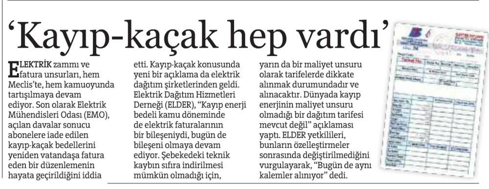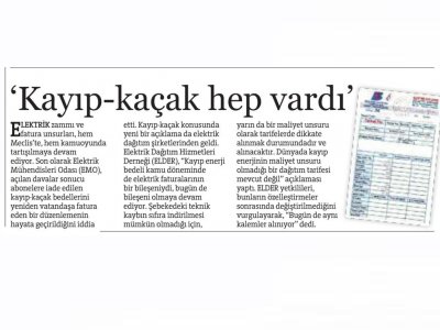 ELEKTRİK zammı ve fatura unsurları, hem Meclis‘te, hem kamuoyunda tartışılmaya devam ediyor. Son olarak Elektrik Mühendisleri Odası (EMO), açılan davalar sonucu abonelere iade edilen kayıp-kaçak bedellerini yemden vatandaşa fatura eden bir düzenlemenin hayata geçirildiğini iddia etti. Kayıp-kaçak konusunda yeni bir açıklama da elektrik dağıtım şirketlerinden geldi. Elektrik Dağıtım Hizmetleri Derneği (ELDER), "Kayıp enerji bedeli kamu döneminde de elektrik faturalarının bir bileşeniydi, bugün de bileşeni olmaya devam ediyor. Şebekedeki teknik kaybın sıfıra indirilmesi mümkün olmadığı için, yarın da bir maliyet unsuru olarak tarifelerde dikkate alınmak durumundadır ve alınacaktır. Dünyada kayıp enerjinin maliyet unsuru olmadığı bir dağıtım tarifesi mevcut değil" açıklaması yaptı. ELDER yetkilileri, bunların özelleştirmeler sonrasmda değiştirilmediğini vurgulayarak, "Bugün de aynı kalemler almıyor" dedi. (Hürriyet; 03.03.2016)