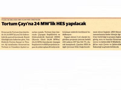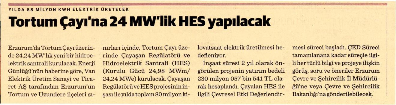 Erzurum‘da Tortum Çayı üzerinde 24.24 MW‘lık yeni bir hidroelektrik santrali kurulacak. Enerji Günlüğü‘nün haberine göre, Van Elektrik Üretim Sanayi ve Ticaret AŞ tarafından Erzurum‘un Tortum ve Uzundere ilçeleri sınırları içinde, Tortum Çayı üzerinde Çayaşan Regülatörü ve Hidroelektrik Santrali (HES) (Kurulu Gücü 24,98 MWm/ 24,24 MWe) kurulacak. Çayaşan Regülatörü ve HES projesinin inşası ile yılda toplam 80 milyon kilovatsaat elektrik üretilmesi hedefleniyor. İnşaat süresi 2 yıl olarak öngörülen projenin yatırım bedeli 230 milyon 057 bin 541 TL olarak hesaplandı. Çayalan HES ile ilgili Çevresel Etki Değerlendirmesi süreci başladı. ÇED Süreci tamamlanana kadar süreçle ilgili her türlü bilgi ve projeye ilişkin görüş, soru ve öneriler Erzurum Çevre ve Şehircilik İl Müdürlüğü‘ne veya Çevre ve Şehircilik Bakanlığı‘na gönderilebilecek. (Dünya; 03.03.2016)