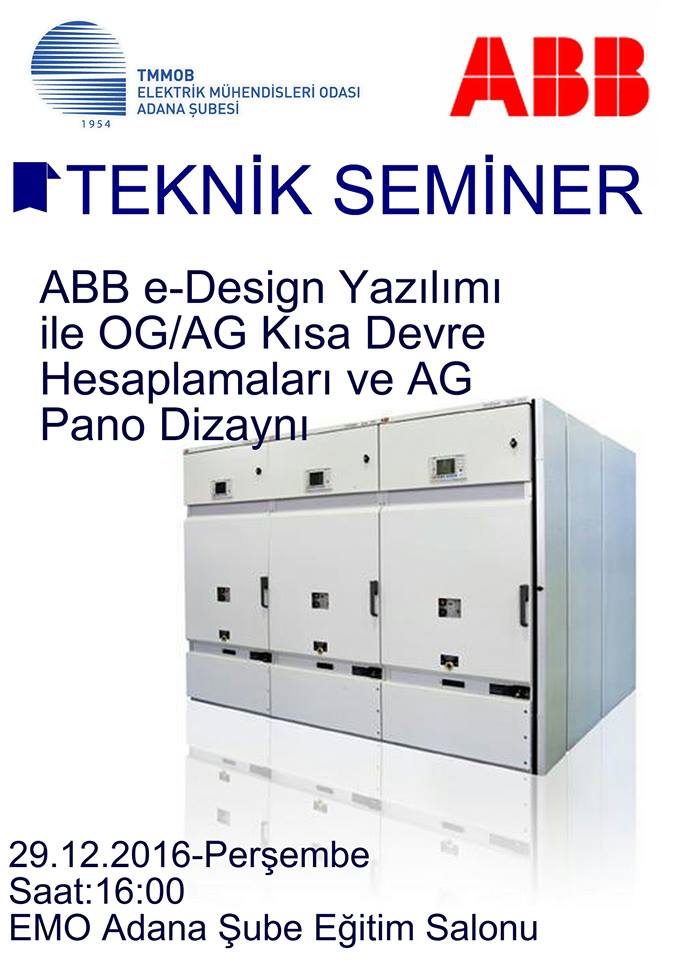 Şubemiz ve ABB Elektrik Sanayi A.Ş. firması işbirliği ile 29 Aralık 2016 Perşembe günü saat: 16:00`da EMO Adana Şubesi Eğitim Salonunda “ABB e-Design Yazılımı ile OG/AG Kısa Devre Hesaplamaları ve AG Pano Dizaynı” konulu seminer verilecektir. Seminere tüm üyelerimiz davetlidir.