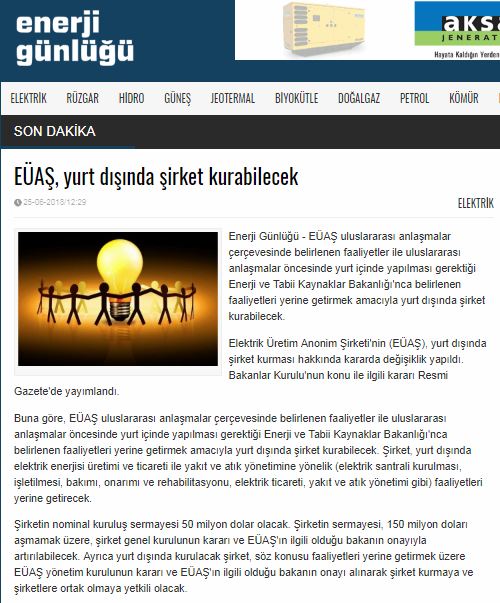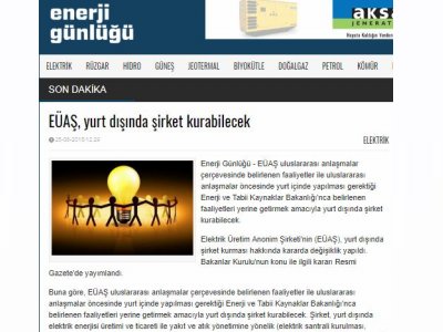 EÜAŞ uluslararası anlaşmalar çerçevesinde belirlenen faaliyetler ile uluslararası anlaşmalar öncesinde yurt içinde yapılması gerektiği Enerji ve Tabii Kaynaklar Bakanlığı‘nca belirlenen faaliyetleri yerine getirmek amacıyla yurt dışında şirket kurabilecek. Elektrik Üretim Anonim Şirketi‘nin (EÜAŞ), yurt dışında şirket kurması hakkında kararda değişiklik yapıldı. Bakanlar Kurulu‘nun konu ile ilgili kararı Resmi Gazete‘de yayımlandı. Buna göre, EÜAŞ uluslararası anlaşmalar çerçevesinde belirlenen faaliyetler ile uluslararası anlaşmalar öncesinde yurt içinde yapılması gerektiği Enerji ve Tabii Kaynaklar Bakanlığı‘nca belirlenen faaliyetleri yerine getirmek amacıyla yurt dışında şirket kurabilecek. Şirket, yurt dışında elektrik enerjisi üretimi ve ticareti ile yakıt ve atık yönetimine yönelik (elektrik santrali kurulması, işletilmesi, bakımı, onarımı ve rehabilitasyonu, elektrik ticareti, yakıt ve atık yönetimi gibi) faaliyetleri yerine getirecek. Şirketin nominal kuruluş sermayesi 50 milyon dolar olacak. Şirketin sermayesi, 150 milyon doları aşmamak üzere, şirket genel kurulunun kararı ve EÜAŞ‘ın ilgili olduğu bakanın onayıyla artırılabilecek. Ayrıca yurt dışında kurulacak şirket, söz konusu faaliyetleri yerine getirmek üzere EÜAŞ yönetim kurulunun kararı ve EÜAŞ‘ın ilgili olduğu bakanın onayı alınarak şirket kurmaya ve şirketlere ortak olmaya yetkili olacak.