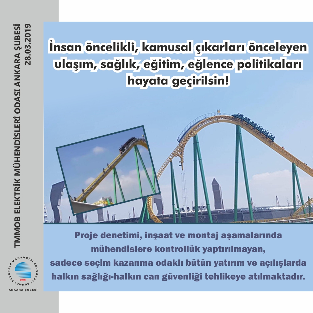 HIZLI TRENİ İŞLETEMEMİŞLERDİ, OYUNCAK TRENİ DE İŞLETEMEDİLER! Kâr amacı güden ve denetimsiz yapılan inşaatlardaki sorumsuzluk Ankapark`ta kendini gösterdi ve 22 Mart 2019 tarihinde bir faciadan dönüldü. 31 Mart yerel seçimleri öncesi gövde gösterisi yapıp oylarını artırmak isteyen "ben yaptım "oldu bitti"ci zihniyet Meslek Odalarının, demokratik kitle örgütlerinin uyarılarını hiçe sayarak insan hayatı üzerinde adeta "oyun oynama"ya devam ediyor.