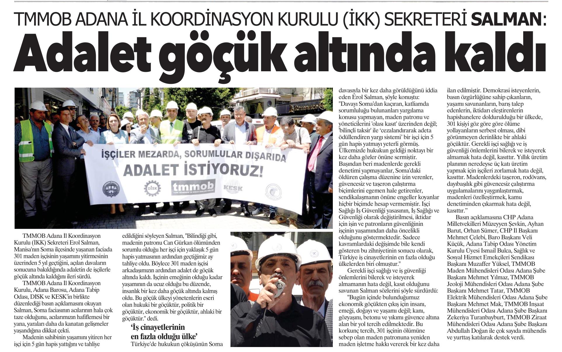 13 Mayıs SOMA da 301 Yitirdiğimiz Madencilerimizi anmanın 5. yıl dönümü olarak TMMOB ADANA İKK-DİSK- KESK-ADANA TABİP ODASI ADANA BAROSU olarak 13 Mayıs 2019 Pazartesi saat 12:30 da TMMOB Maden Mühendisleri Odası önğnde düzenlenen basın açıklamasına katıldık. Basında çıkan haberler görseldedir.