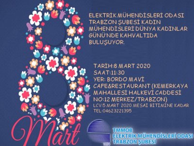 8 Mart Dünya Kadınlar Günü münasebetiyle 8 Mart 2020 Pazar Günü saat 11.30`da Bordo Mavi Cafe&Restaurant`ta (Kemerkaya,Halkevi Cd.No:12 Merkez/Trabzon) kadın üyelerimize yönelik kahvaltı düzenlenecektir.