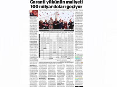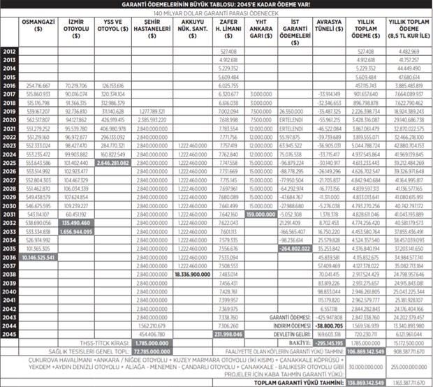 Kamu-özel-işbirliği projelerinden 8’inin garanti yükü 100 milyar doların üzerinde gözükmektedir. Garantiler döviz cinsi olduğu için kur değiştikçe yükü de değişiyor. Diğer projelerle kaba tahminde bulunursak 140 milyar dolar civarında bir garanti yükünden söz edilebilir.