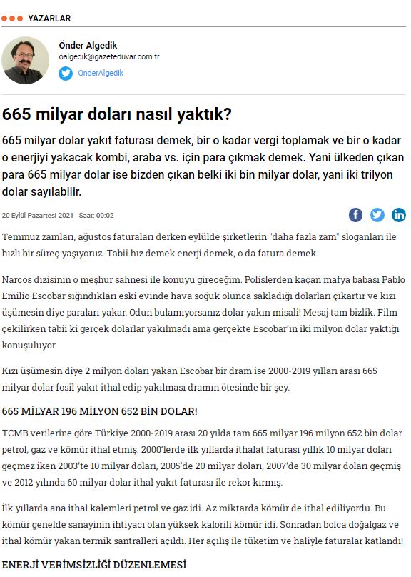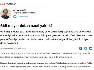 Temmuz zamları, ağustos faturaları derken eylülde şirketlerin "daha fazla zam" sloganları ile hızlı bir süreç yaşıyoruz. Tabii hız demek enerji demek, o da fatura demek. Narcos dizisinin o meşhur sahnesi ile konuyu gireceğim. Polislerden kaçan mafya babası Pablo Emilio Escobar sığındıkları eski evinde hava soğuk olunca sakladığı dolarları çıkartır ve kızı üşümesin diye paraları yakar. Odun bulamıyorsanız dolar yakın misali! Mesaj tam bizlik. Film çekilirken tabii ki gerçek dolarlar yakılmadı ama gerçekte Escobar`ın iki milyon dolar yaktığı konuşuluyor. Kızı üşümesin diye 2 milyon doları yakan Escobar bir dram ise 2000-2019 yılları arası 665 milyar dolar fosil yakıt ithal edip yakılması dramın ötesinde bir şey. 665 MİLYAR 196 MİLYON 652 BİN DOLAR! TCMB verilerine göre Türkiye 2000-2019 arası 20 yılda tam 665 milyar 196 milyon 652 bin dolar petrol, gaz ve kömür ithal etmiş. 2000`lerde ilk yıllarda ithalat faturası yıllık 10 milyar doları geçmez iken 2003`te 10 milyar doları, 2005`de 20 milyar doları, 2007`de 30 milyar doları geçmiş ve 2012 yılında 60 milyar dolar ithal yakıt faturası ile rekor kırmış. İlk yıllarda ana ithal kalemleri petrol ve gaz idi. Az miktarda kömür de ithal ediliyordu. Bu kömür genelde sanayinin ihtiyacı olan yüksek kalorili kömür idi. Sonradan bolca doğalgaz ve ithal kömür yakan termik santralleri açıldı. Her açılış ile tüketim ve haliyle faturalar katlandı! ENERJİ VERİMSİZLİĞİ DÜZENLEMESİ Türkiye 2007`de enerji verimliliği konusunda bir kanun geçirdi ve ertesi yıl bunu ikincil mevzuat ile destekledi. Binalarda ve ulaşımda enerji verimliliği yönetmeliği, genelgeler vs. hepsi 2008`de karşımıza çıktı. 2007`de 33,8 milyar dolar olan ithal faturası 2008`de 48,3 milyar dolara dayandı. Düzenlemenin ‘tam oturdu‘ denileceği zamanlarda, mesela 2011`de ithalat 55,9 milyar dolara çıkarak cumhuriyet tarihinin rekorunu kırdı. İthalatı arttırmak için kasabalara ve hatta güneşin bol olduğu güney illerimize gaz getirildi, kömür santrallerine yol verildi. Yetmedi, toplu taşıma öldürüldü ve her yere altgeçit ve üstgeçit yapılarak ve asfalt dökülerek insanların daha çok otomobil kullanması sağlandı. O da yetmedi, kentsel dönüşüme engel olur diye bütün binalarda verimlilik düzenlemeleri ertelendi. Kısaca, temel bir verimlilik düzenlemesinin ölümcül bir silaha dönüşmesinin hikayesi diyebiliriz. Şu an ülkenin enerji verimliliği konusunda çalışan bir bakanlığı yok. Bunu mesele eden partilerimiz yok. Bunun kavgasını verecek bir siyaset yok. Ama fazlası var. ZAMMA ZAM İSTENİYOR! 665 milyar dolar yakıt faturası demek, bir o kadar vergi toplamak ve bir o kadar o enerjiyi yakacak kombi, araba vs. için para çıkmak demek. Yani ülkeden çıkan para 665 milyar dolar ise bizden çıkan belki iki bin milyar dolar, yani iki trilyon dolar sayılabilir. Ama bu faturaya, zaten parası bizden çıkmış elektrik altyapısını özelleştirilmesi, bunların kredisi, şirketlerin teşvikleri, şirketlerin kârları, gider kalemlerinin halka ödetilmesi dahil değil. Geçtiğimiz günlerde Elektrik Dağıtım Hizmetleri Derneği`nin yeni zam istediği haberi düşmüş, sonrasında da zammın kaynağı olarak doğalgazı gösterdikleri bir açıklama yapmışlardı. Son 5 yılda enerji şirketleri için 10 kanun düzenlemesi yapıldığını ve bunların sonucunda şirketlerin ihtiyacı olan zamların son 5 yılda nasıl yapıldığını bildiğimizden, konu bizim açımızdan netti. Basit iki tablodan oluşan bir zaman çizelgesiyle kanunların nasıl zamların altyapısını hazırladığını artık net olarak biliyoruz. 10 MİLYAR TL HALKI ÇARPTI! Politika çok belli, bir taraftan çok tükettirme ve bunun için enerji tüketimini verimsizleştirmek, diğer taraftan zam yaparak toplanan gelirlerin artışını ikiye katlamak. Böyle olduğunu son bir ayda iliklerine kadar hissetmeyen vatandaş kalmadı. Tabii şimdi 665 milyar dolar ithalat, bir o kadar vergi ve bir o kadar aleti, cihazı derken faturanızı kesemiyoruz. Bunların dışında başka küçük dokunuşlar da var. Son günlerde hayatımızı anlamlandıracak bir haber düştü ve dağıtım şirketlerinin anlatılmayan hikayesi ortaya çıktı. EÜAŞ`dan ucuza elektriği alan ve bize yüksekten fatura eden dağıtım şirketlerinin 2020 yılında sadece EÜAŞ indirimlerinden elde ettiği kâr yaklaşık 10 milyar TL.. EMO`nun bu açıklaması hafta sonu hepimizi çarptı. Tek kalemde 10 milyar TL, bir milyar doların üstünde! 2020 yılında Türkiye`nin elektrik tüketimi ortalama 33 bin MWh olarak gerçekleşti. Anlık olarak ise en fazla 45 bin MW`ı gördü. Eğer verimlilik politikaları olsaydı anlık 35 bin MWh seviyesine, ortalama da 25 bin MWh seviyesine doğru inecekti. Türkiye`nin yakıt ithalatında rekor kırdığı 2012`de kurulu gücü 57 bin MW idi. Şimdi ne kadar biliyor musunuz? Ağustos 2021 itibariyle 98 bin 492 MW! Neredeyse 40 bin MW fazla. Her bir megawatt kurulu gücün yaklaşık bir milyon doların üstünde yatırım maliyeti olduğunu düşünürsek 40 bin mw`lık âtıl kapasitenin bize yatırım maliyeti ise 40 milyar dolar civarında! KİM ÇEYREK TRİLYON DOLAR İSTER? Verimlilik sahipsiz dedik ya, aslında biz sahip çıkabilir, ayağa kaldırabilir, kırlarda koşturabiliriz. Böylece enerjimiz içimizde patlamaz, cüzdanımıza yansımaz. Tabii kombiyi bir derece kısmaktan bahsetmiyorum. Bunun da ötesinde bir şey kastım. Düşünsenize, 20 yılda sadece basit bir verimlilik hareketi ile yüzde 1 tasarruf sağlasak bu 6 milyar 665 milyon dolar demek! Hem de temiz para. Yüzde onluk bir tasarruf 66 milyar 650 milyon dolar. Ki benim gönlümden geçen en az yüzde 40 tasarruf, ki 250 milyar dolardan fazla ithalat faturasından tasarruf demek. Ama dahası var. Size çeyrek trilyon dolardan faz