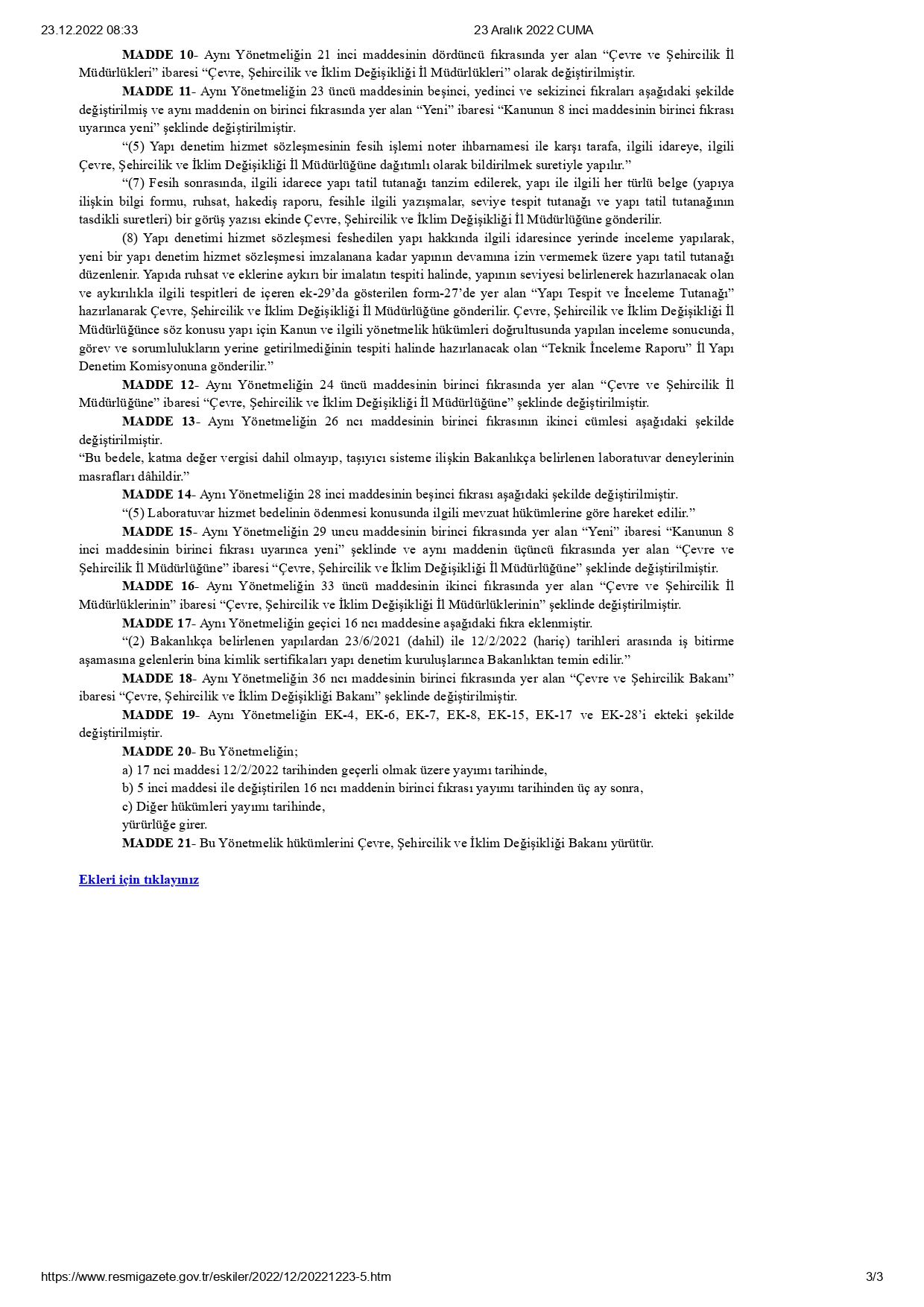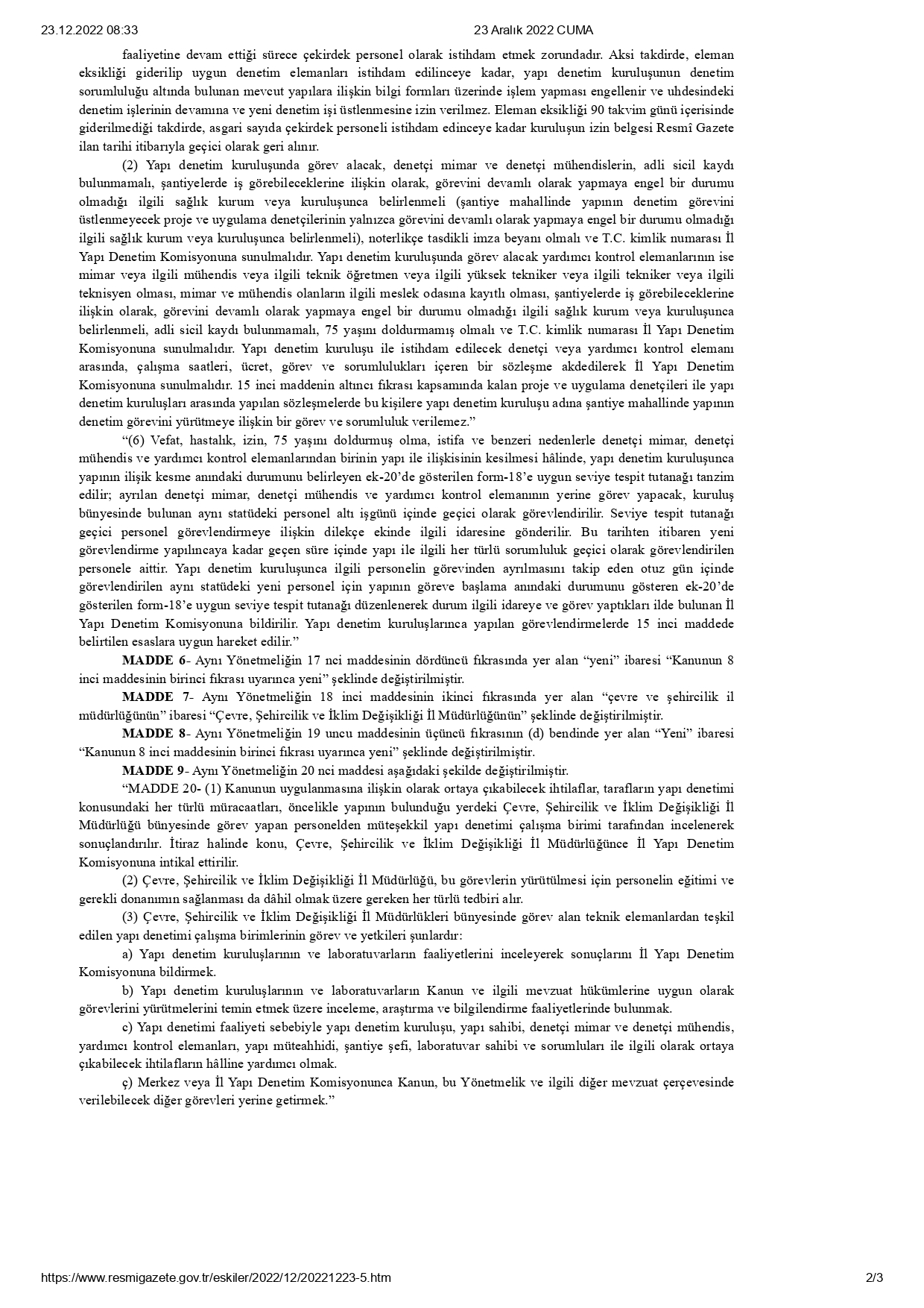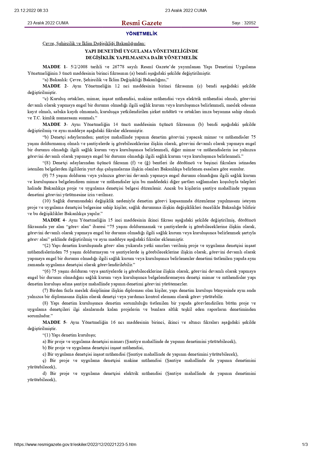 Kıymetli Üyelerimiz, Mevzuat Takip Sistemimiz bilgilendirmesine göre `Yapı Denetimi Uygulama Yönetmeliğinde Değişiklik Yapılmasına Dair Yönetmelik` 23.12.2022 Tarih ve 32052 Sayılı Resmi Gazetede yayımlanmıştır.