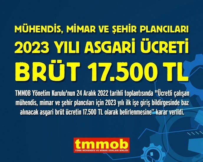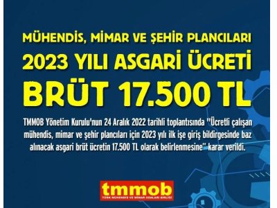 TMMOB Yönetim Kurulu 2023 yılı ilk işe giriş bildirgesinde baz alınacak mühendis, mimar ve şehir plancısı asgari ücretini brüt 17.500TL olarak belirledi.