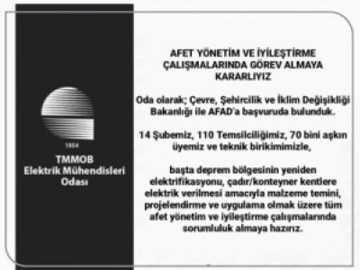 Elektrik Mühendisleri Odası (EMO) 48. Dönem Yönetim Kurulu, Çevre, Şehircilik ve İklim Değişikliği Bakanlığı ile Afet ve Acil Durum Yönetimi Başkanlığı`na 8 Şubat 2022 tarihinde birer yazı gönderdi. 6 Şubat 2023 tarihinde meydana gelen Pazarcık ve Elbistan merkezli 2 büyük depremin milyonlarca yurttaşımızın yaşadığı 10 ilimizde büyük yıkımlara yol açtığı ifade edilen yazıda, şöyle denildi: "Elektrik Mühendisleri Odası olarak; 14 Şubemiz ve 110 Temsilciliğimizle, başta bölgenin yeniden elektrifikasyonu ve depremden etkilenen insanlarımız için kurulacak olan çadır/konteyner kentlere güvenli bir biçimde elektrik verilebilmesi amacıyla malzeme temini, projelendirme ve uygulamanın sağlanması olmak üzere, tüm afet yönetim ve iyileştirme çalışmalarında sorumluluk almaya ve iş birliğine hazır olduğumuzu bildirmek isteriz. İhtiyaç duyulan bölgelerin, kadroların ve hizmetlerin tarafımıza iletilmesi halinde, 70 bini aşkın üyemiz ve teknik birikimimizle, gerekli desteği sağlamak üzere hızla organizasyon yapılacaktır." EMO, resmi olarak yaptığı bu başvuruya kısa süre içerisinde olumlu yanıt verilmese dahi, bütün olanaklarını seferber ederek üzerine düşen sorumluluğu yerine getirme konusunda kararlıdır. Bu kapsamda üyelerimizle birlikte tüm bilgi, birikim ve tecrübelerimizi depremden etkilenen yurttaşlarımızın hizmetine sunmaya hazırız.