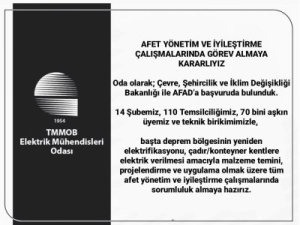 Elektrik Mühendisleri Odası (EMO), Çevre, Şehircilik ve İklim Değişikliği Bakanlığı ile AFAD’a başvurarak, başta deprem bölgesinin yeniden elektrifikasyonu, çadır/konteyner kentlere elektrik verilmesi amacıyla malzeme temini, projelendirme ve uygulama olmak üzere tüm afet yönetim ve iyileştirme çalışmalarında sorumluluk almaya hazır olduğunu bildirdi.