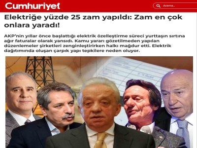 www.cumhuriyet.com.tr AKP`nin elektrik piyasasında yaptığı özelleştirme adımları, şirketlerin kârını artırırken yurttaşın cebine daha fazla yük bindiriyor. Elektrik piyasasını üretim, iletim ve dağıtım olarak üçe ayıran iktidar, Türkiye`yi 20 dağıtım bölgesine bölerek kontrolü özel şirketlere devretmişti. "Hizmet kalitesi artacak, fiyatlar düşecek" söylemleriyle başlayan bu süreçte, zamanla kalite gerilerken, elektrik faturaları da sürekli artan zamlarla birlikte kabardı.