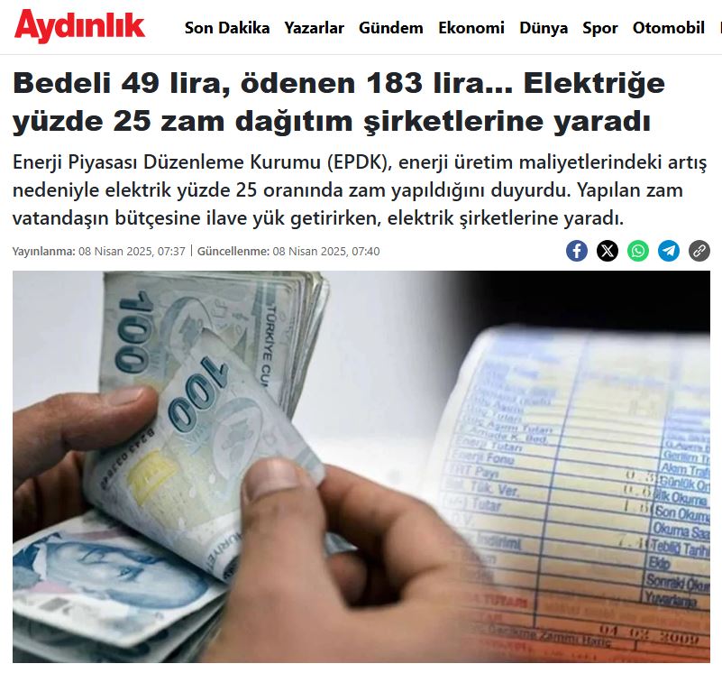 Sözcü Gazetesi‘nden Erdoğan Süzer‘in haberine göre; Zam yüzünden vatandaşların her ay elektriğe 5.3 milyar lira fazladan para ödeyeceği ve bu paranın şirketlerin kasasına akacağı hesaplandı. 1 kilovatsaat elektriğin enerji üretim bedeli sadece 49.4 TL buna karşılık elektrik dağıtım şirketine ödenen bedel ise 183.6 TL. Diğer bir deyişle, 100 liralık elektriğin 79 lirası dağıtım şirketlerinin kasasına giderken elektrik bedeli olarak aslında 21 lira ödüyoruz.