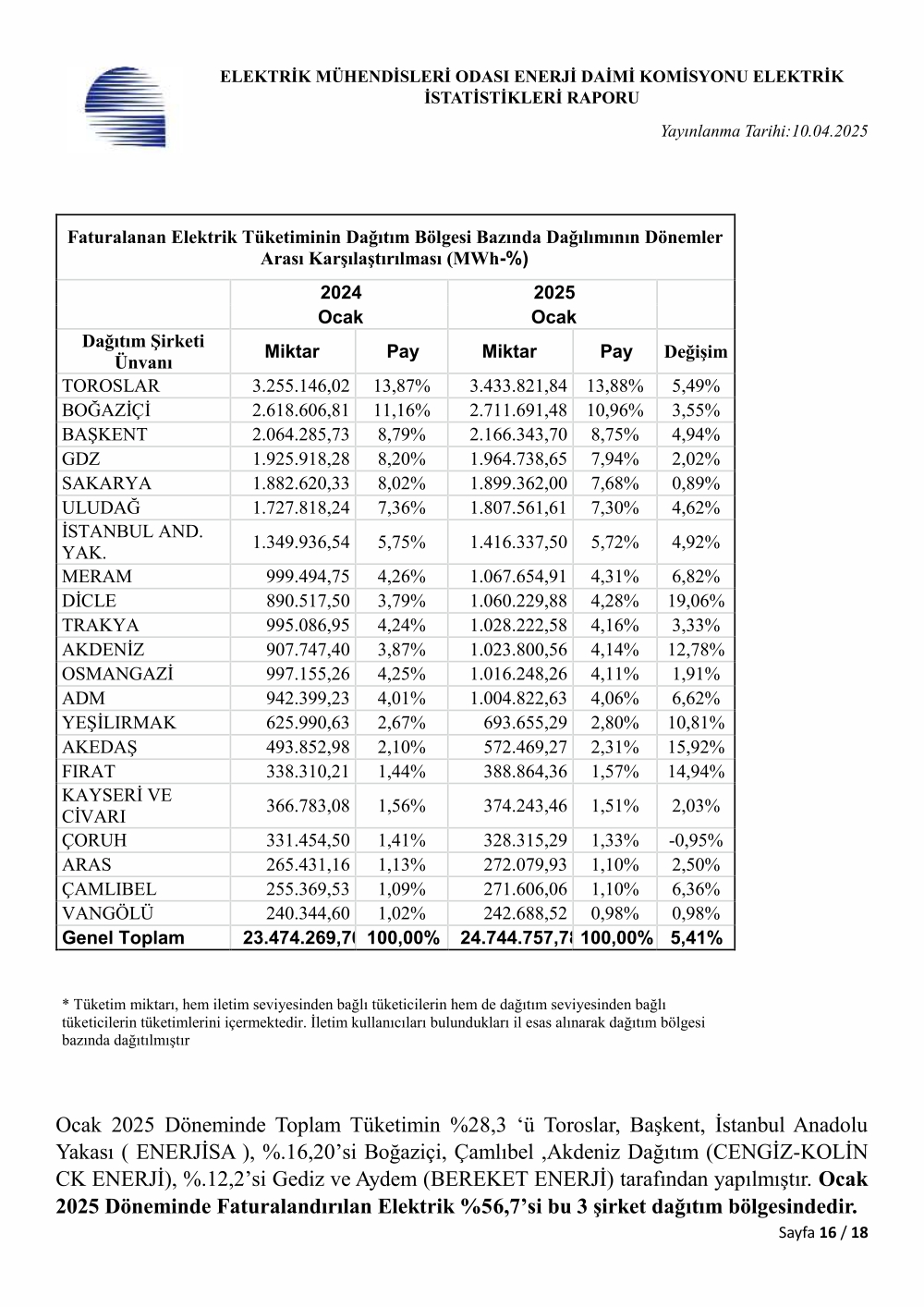 ELEKTRİK MÜHENDİSLERİ ODASI ENERJİ DAİMİ KOMİSYONU ELEKTRİK İSTATİSTİKLERİ RAPORU İNDİRMEK İÇİN TIKLAYINIZ AÇIKLAMA: Hazırlanan rapor TEİAŞ Yük Tevzi Bilgi Sistemi (YTBS) İstatistikler kısmında yayınlanan 31.03.2025 tarihli günlük/yıllık işletme cetvelleri, Enerji Piyasası Düzenleme Kurulu (EPDK) tarafından en son yayınlanan Aylık Sektör Raporları (Ocak 2025 Raporu) ve EPİAŞ Şeffaflık Platformu sayfasında yayınlanan değerlere göre hazırlanmıştır.