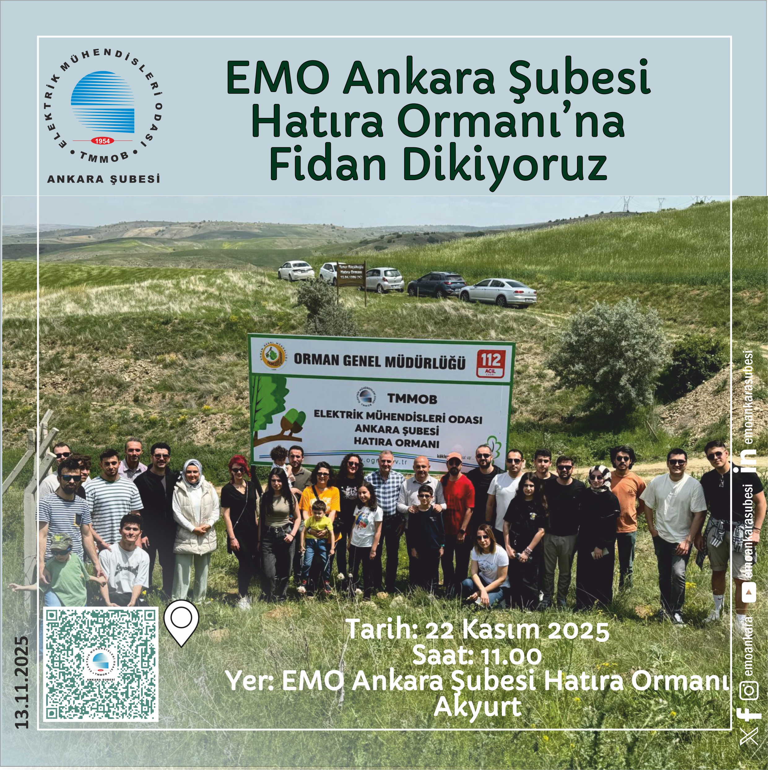 EMO Ankara Şubesi Hatıra Ormanı’na fidan dikiyoruz, 22 Kasım 2025 Cumartesi günü saat 11.00’de yapılacak olan fidan dikimine tüm üyelerimiz davetlidir. Etkinliğe katılmak isteyen üyelerimiz haberimizin devamındaki formu doldurabilirler. Akyurt’taki hatıra Ormanı’nın konumu ve online form linki haberimizin devamındadır.