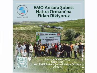EMO Ankara Şubesi Hatıra Ormanı’na fidan dikiyoruz, 22 Kasım 2025 Cumartesi günü saat 11.00’de yapılacak olan fidan dikimine tüm üyelerimiz davetlidir. Etkinliğe katılmak isteyen üyelerimiz haberimizin devamındaki formu doldurabilirler. Akyurt’taki hatıra Ormanı’nın konumu ve online form linki haberimizin devamındadır.