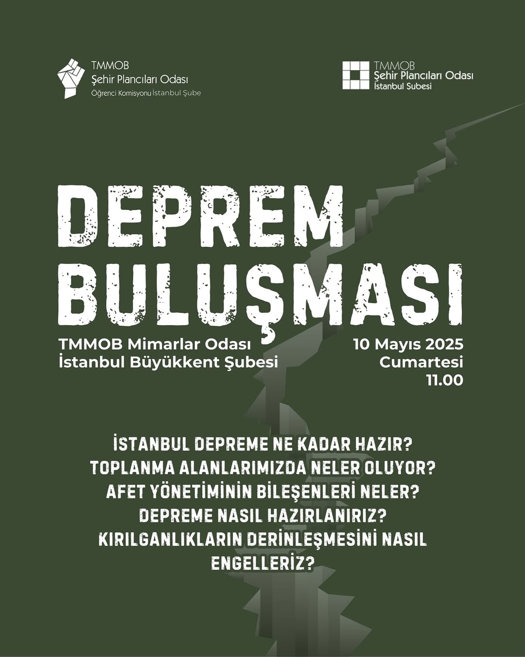TMMOB Şehir Plancıları Odası İstanbul Şubesi ve Öğrenci Komisyonu kentlerimizi depreme karşı daha dirençli hale getirme amacıyla Deprem Buluşması etkinliğinde bir araya geliyor.