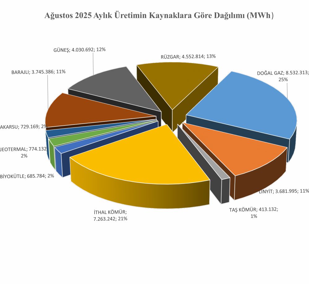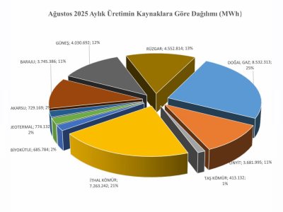 • Ağustos 2025 döneminde 34.766.151 MWh toplam üretimin %24,5`i Doğalgaz, %32,7`si Linyit+Taş Kömürü+İthal Kömür, %12,9`u Akarsu+Barajlar, %11,6`si Güneş, %13,1`i Rüzgar, %2,2`si Jeotermal Santrallerinden üretilmiştir