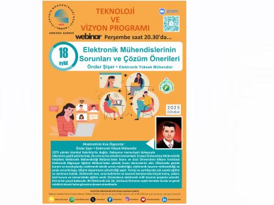 Teknoloji ve Vizyon Programı kapsamında Elektronik Mühendislerinin Sorunları ve Çözüm Önerileri başlıklı webinar 18 Eylül 2025 Perşembe Günü Saat:20.30’da Elektronik Yüksek Mühendisi Önder Şişer’in moderatörlüğünde Zoom üzerinden gerçekleştirilecektir.