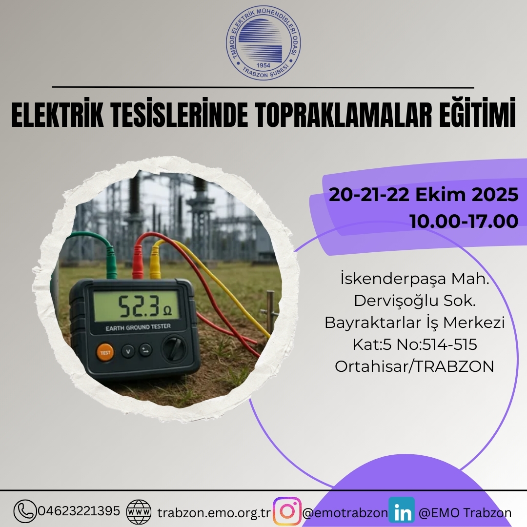 Kıymetli Üyemiz, Şubemizde 20-21-22 Ekim 2025 tarihlerinde yüz yüze Elektrik Tesislerinde Topraklamalar Eğitimi düzenlenecektir.