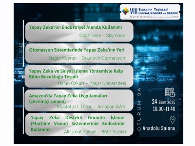 Elektrik Mühendisleri Odası (EMO) adına EMO İzmir Şubesi’nin düzenlediği VIII. Elektrik Tesisleri Ulusal Kongre ve Sergisi`nin (ETUK 2025) programı yayımlandı. Tepekule Kongre ve Sergi Merkezi Anadolu Salonu`nda 24 Ekim 2025 Cuma günü düzenlenen 9A Oturumu, yapay zeka uygulamalarına odaklanan sunumlarla gerçekleştiriliyor. Program ayrıntılarına ve kayıt bağlantısına yazımızın devamından ulaşabilirsiniz.