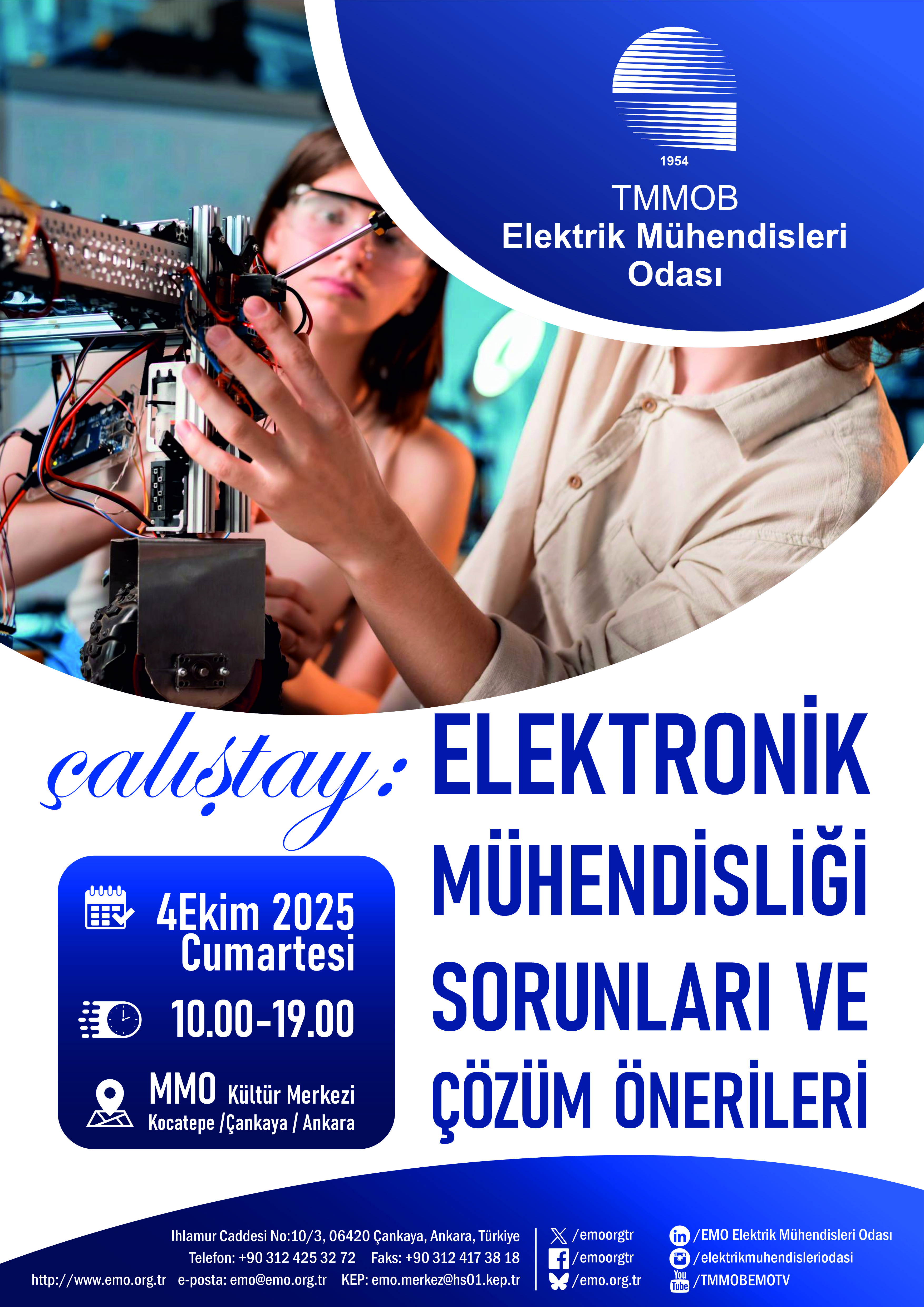 Elektrik Mühendisleri Odası (EMO), elektronik mühendisliği alanında yaşanan güncel sorunları tartışmak ve çözüm önerileri geliştirmek amacıyla “Elektronik Mühendisliği Sorunları ve Çözüm Önerileri” başlıklı bir çalıştay düzenlemektedir. Etkinlik, 04 Ekim 2025 Cumartesi günü 10.00–19.00 saatleri arasında Ankara MMO Kültür Merkezi’nde gerçekleştirilecektir.