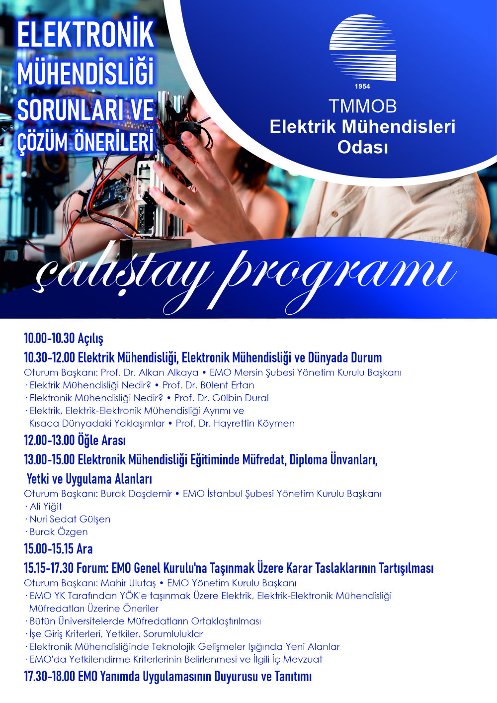 Program, açılışın ardından "Elektrik Mühendisliği, Elektronik Mühendisliği ve Dünyada Durum" başlıklı oturumla başlayacaktır. Başkanlığını EMO Mersin Şubesi Yönetim Kurulu Başkanı Prof. Dr. Alkan Alkaya`nın üstlendiği oturumda Prof. Dr. Bülent Ertan, Prof. Dr. Gülbin Dural ve Prof. Dr. Hayrettin Köymen sunumlarıyla elektronik ve elektrik-elektronik mühendisliği disiplinlerinin tarihsel ve küresel bağlamdaki gelişimini değerlendirecektir.