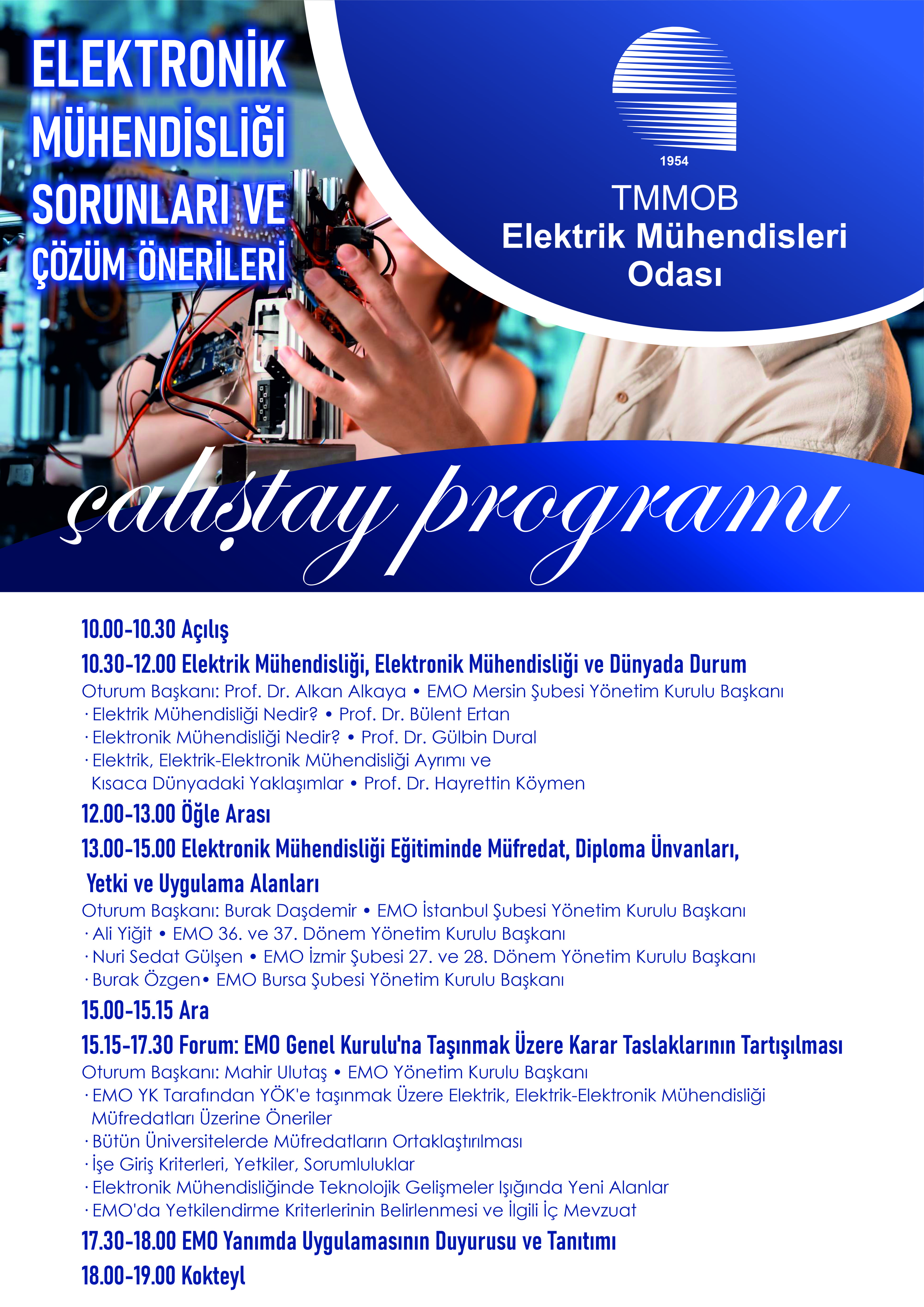 Program, açılışın ardından "Elektrik Mühendisliği, Elektronik Mühendisliği ve Dünyada Durum" başlıklı oturumla başlayacaktır. Başkanlığını EMO Mersin Şubesi Yönetim Kurulu Başkanı Prof. Dr. Alkan Alkaya`nın üstlendiği oturumda Prof. Dr. Bülent Ertan, Prof. Dr. Gülbin Dural ve Prof. Dr. Hayrettin Köymen sunumlarıyla elektronik ve elektrik-elektronik mühendisliği disiplinlerinin tarihsel ve küresel bağlamdaki gelişimini değerlendirecektir.