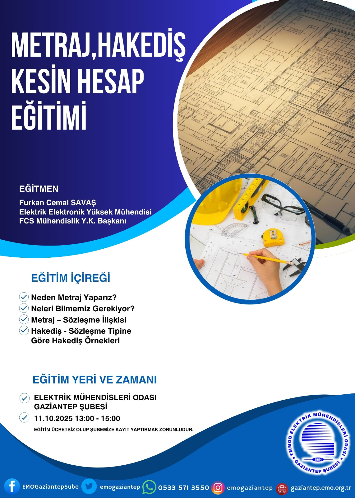 11 Ekim 2025 tarihinde 13:00-15:00 saatleri arasında Şubemiz eğitim salonunda Metraj,Hakediş,Kesin Hesap eğitimi düzenlenecektir. Eğitim ücretsiz olup şubemize kayıt yaptırmak zorunludur.