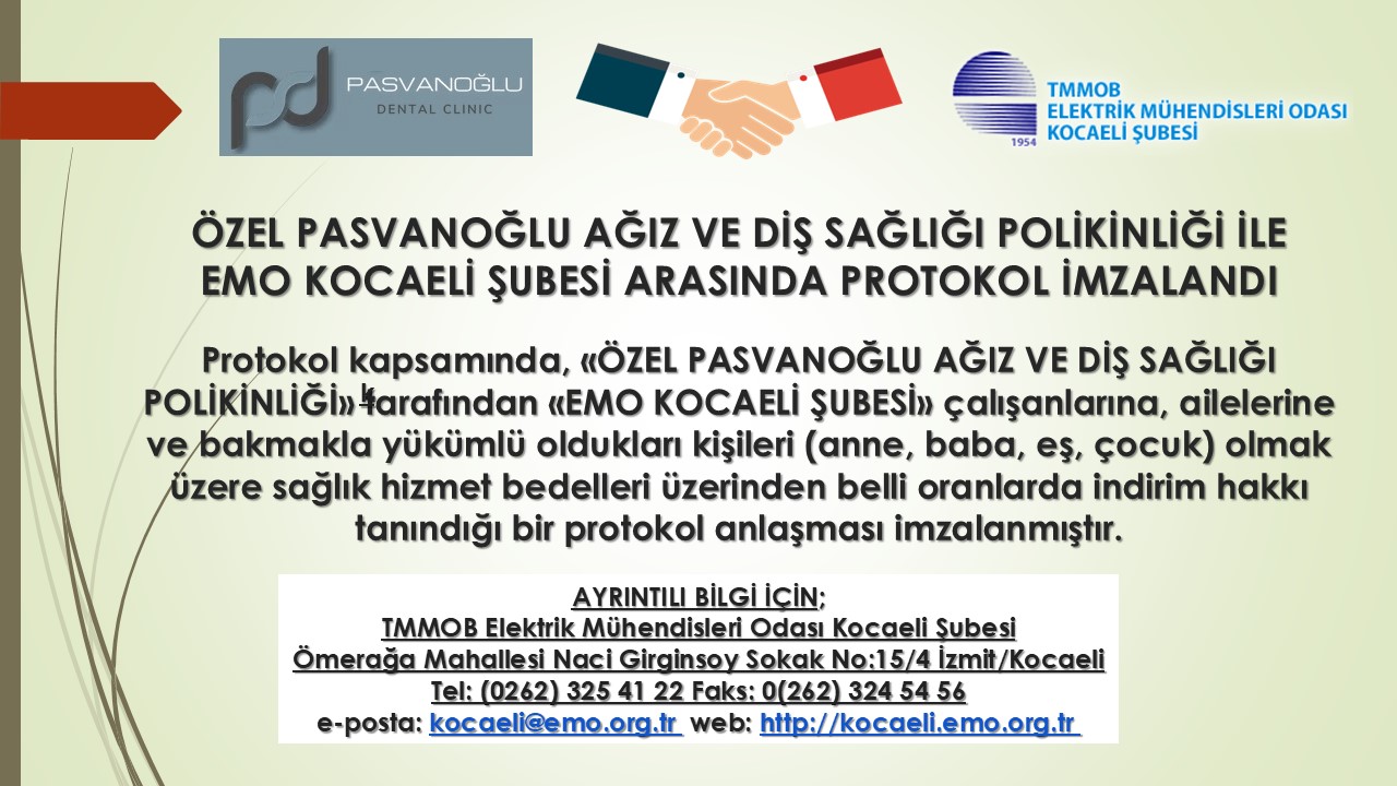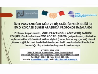 Protokol kapsamında, «Özel Pasvanoğlu Ağız ve Diş Sağlığı Polikinliği» tarafından EMO Kocaeli Şubesi çalışanlarına, ailelerine ve bakmakla yükümlü oldukları kişileri (anne, baba, eş, çocuk) olmak üzere sağlık hizmet bedelleri üzerinden belli oranlarda indirim hakkı tanındığı bir protokol anlaşması imzalanmıştır.
