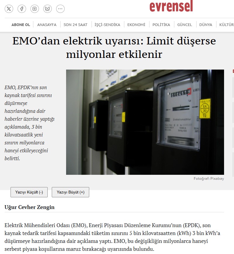 "Kamu yararı değil, piyasa lehine düzenleme" Son kaynak tarifesinin ilk kez 2018`de yalnızca büyük sanayi tesislerini kapsayacak şekilde yürürlüğe girdiğini hatırlatan EMO, sınırın yıllar içinde sürekli düşürülerek sanayiden hanelere kadar yayıldığını belirtti. EMO, 2018`de 50 milyon kWh olan limitin 2024 sonu itibariyle 5 bin kWh`a kadar indirildiğini, şimdi ise 3 bin kWh`a çekilmesinin gündemde olduğunu vurguladı.