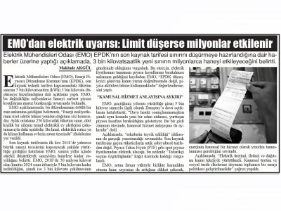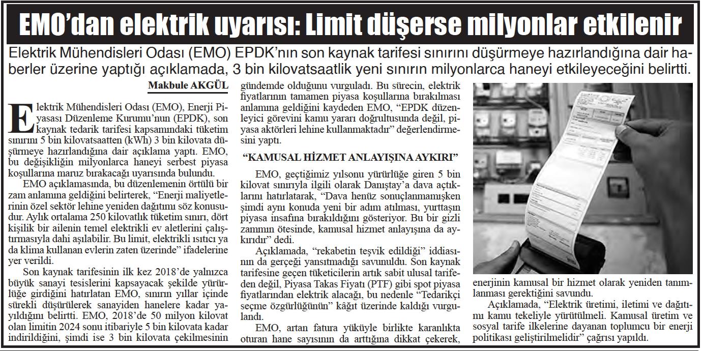 EMO dan elektrik uyarısı: Limit düşerse milyonlar etkilenir. Elektrik Mühendisleri Odası (EMO), Enerji Piyasası Düzenleme Kurumu`nun (EPDK). son kaynak tedarik tarifesi kapsamındaki tüketim sınırını 5 bin kilovatsaatten (kWh) 3 bin kilovata düşülmeye hazırlandığına dair açıklama yaptı.