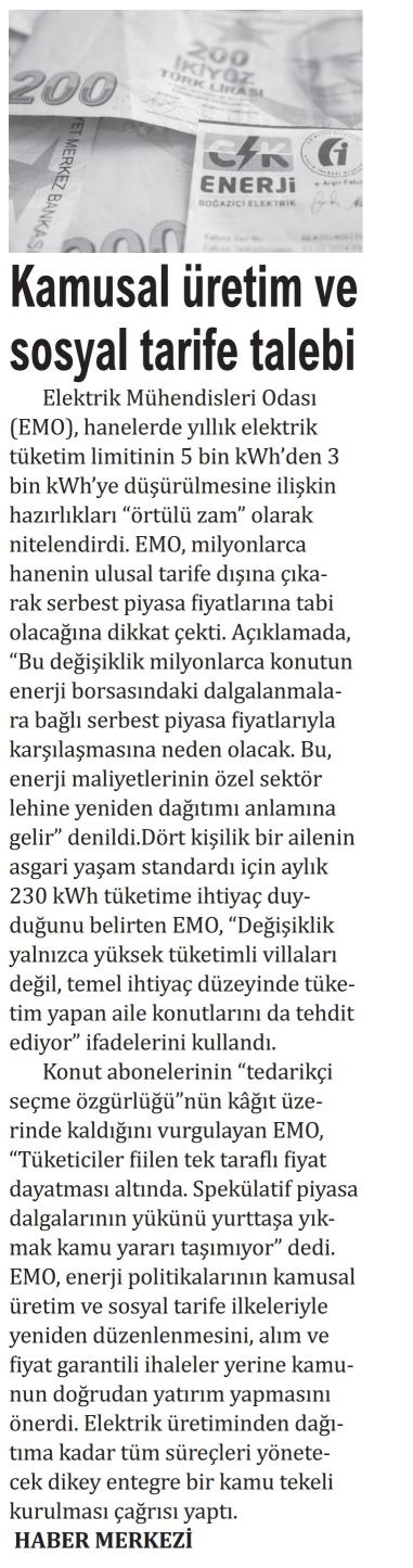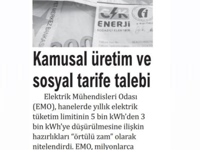 Kamusal üretim ve sosyal tarife talebi: Elektrik Mühendisleri Odası (EMO], hanelerde yıllık elektrik tüketim limitinin 5 bin kVVh`den 3 bin kVVh`ye düşürülmesine ilişkin hazırlıkları `örtülü zam` olarak nitelendirdi.