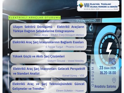 VIII. Elektrik Tesisleri Ulusal Kongre ve Sergisi (ETUK 2025) kapsamında 23 Ekim 2025 Perşembe günü düzenlenen 8A oturumunda elektrikli araçlar ve şarj teknolojilerine ilişkin gelişmelere odaklanan bildiriler sunulacak.