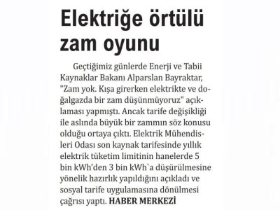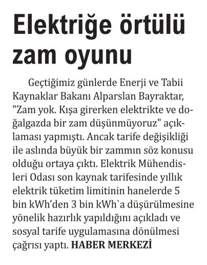 Geçtiğimiz günlerde Enerji ve Tabii Kaynaklar Bakanı Alparslan Bayraktar, `Zam yok. Kışa girerken elektrikte ve doğalgazda bir zam düşünmüyoruz` açıklaması yapmıştı. Ancak tarife değişikliği ile aslında büyük bir zammın söz konusu olduğu ortaya çıktı. Elektrik Mühendisleri Odası son kaynak tarifesinde yıllık elektrik tüketim limitinin hanelerde 5 bin kVVh`den 3 bin kVVh`a düşürülmesine yönelik hazırlık yapıldığım açıkladı ve sosyal tarife uygulamasına dönülmesi çağrısı yaptı.