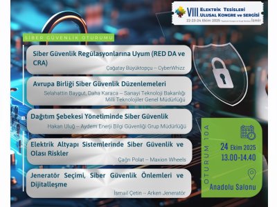 VIII. Elektrik Tesisleri Ulusal Kongre ve Sergisi (ETUK 2025) kapsamında 24 Ekim 2025 Cuma günü düzenlenen 10A oturumunda siber güvenlik konularına ilişkin gelişmelere odaklanan bildiriler sunulacak.