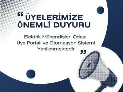 Elektrik Mühendisleri Odası Üye Portalı ve Otomasyon Sistemi gelişen teknolojinin ve üyelerimizin güncel ihtiyaçlarına daha iyi ve daha hızlı cevap verebilmek için yenilenmektedir. Bir süredir devam eden yenileme çalışmalarında sona gelinmiş ve 13 Ekim 2025 tarihi itibariyle planlı bir altyapı taşıması başlatılmıştır. Bir hafta süreyle üyelerimizin Portal`a erişimi mümkün olmayacaktır. İhtiyaç duyulan tüm işlemler şubelerimizden ve bağlı birimlerimizden gerçekleştirilebilecektir. Yeni portalın duyurusu en kısa sürede sizlere ulaştırılacaktır. Bu teknik çalışma süresince anlayış göstereceğinizi umuyor, olası aksaklıklar için özür diliyoruz.