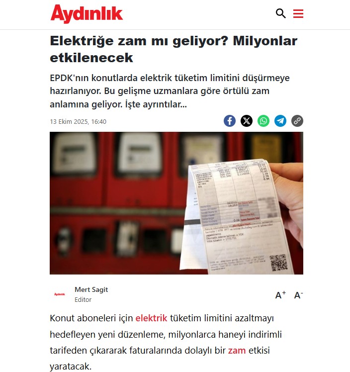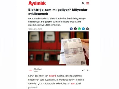 www.aydinlik.com.tr Konut aboneleri için elektrik tüketim limitini azaltmayı hedefleyen yeni düzenleme, milyonlarca haneyi indirimli tarifeden çıkararak faturalarında dolaylı bir zam etkisi yaratacak.