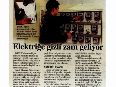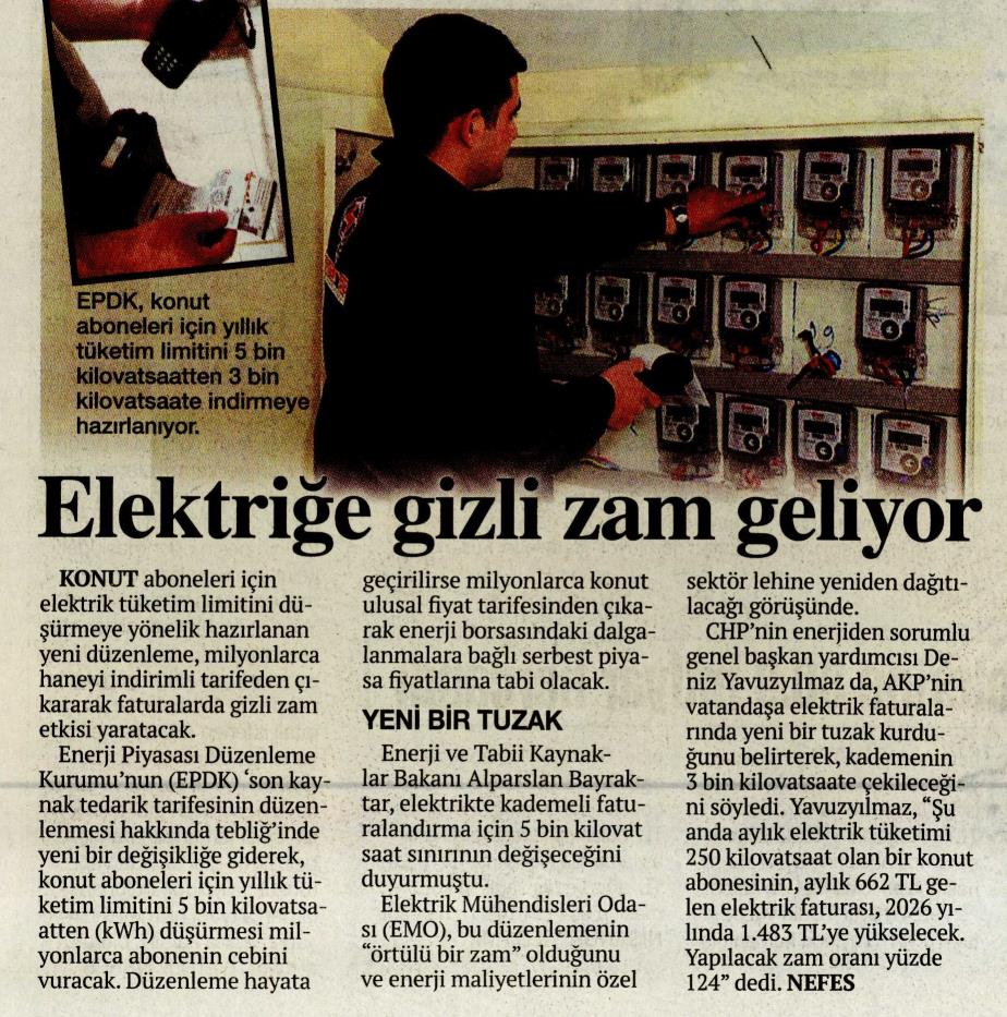 KONUT aboneleri için elektrik tüketim limitini düşürmeye yönelik hazırlanan yeni düzenleme, milyonlarca haneyi indirimli tarifeden çıkararak faturalarda gizli zam etkisi yaratacak. Enerji Piyasası Düzenleme Kurumu‘nun (EPDK) ‘son kaynak tedarik tarifesinin düzenlenmesi hakkında tebliğ‘inde yeni bir değişikliğe giderek, konut aboneleri için yıllık tüketim limitini 5 bin kilovatsaatten (kWh) düşürmesi milyonlarca abonenin cebini vuracak. Düzenleme hayata geçirilirse milyonlarca konut ulusal fiyat tarifesinden çıkarak enerji borsasındaki dalgalanmalara bağlı serbest piyasa fiyatlarına tabi olacak. YENİ BİR TUZAK Enerji ve Tabii Kaynaklar Bakanı Alparslan Bayraktar, elektrikte kademeli faturalandırma için 5 bin kilovat saat sınırının değişeceğini duyurmuştu. Elektrik Mühendisleri Odası (EMO), bu düzenlemenin "örtülü bir zam" olduğunu ve enerji maliyetlerinin özel sektör lehine yeniden dağıtılacağı görüşünde. CHP‘nin enerjiden sorumlu genel başkan yardımcısı Deniz Yavuzyılmaz da, AKP‘nin vatandaşa elektrik faturalarında yeni bir tuzak kurduğunu belirterek, kademenin 3 bin kilovatsaate çekileceğini söyledi. Yavuzyılmaz, "Şu anda aylık elektrik tüketimi 250 kilovatsaat olan bir konut abonesinin, aylık 662 TL gelen elektrik faturası, 2026 yılında 1.483 TL‘ye yükselecek. Yapılacak zam oranı yüzde 124" dedi.