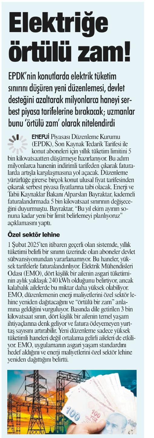 Enerji Piyasası Düzenleme Kurumu (EPDK), Son Kaynak Tedarik Tarifesi ile konut aboneleri için yıllık tüketim limitini 5 bin kilovatsaatten düşürmeye hazırlanıyor. Bu adım milyonlarca hanenin indirimli tarifeden çıkarak faturalarda artışla karşılaşmasına yol açacak. Düzenleme yürürlüğe girerse birçok konut ulusal fiyat tarifesinden çıkarak serbest piyasa fiyatlarına tabi olacak. Enerji ve Tabii Kaynaklar Bakanı Alparslan Bayraktar, kademeli faturalandırmada 5 bin kilovatsaat sınırının değişeceğini duyurmuştu. Bayraktar, "Bu yıl ekim ayının sonuna kadar yeni bir limit belirlemeyi planlıyoruz" açıklamasını yaptı. Özel sektör lehine 1 Şubat 2025‘ten itibaren geçerli olan sistemde, yıllık tüketimi belirli bir sınınn üzerinde olan aboneler devlet sübvansiyonundan yararlanamıyor. Bu haneler, yüksek tarifelerle faturalandınlıyor. Elektrik Mühendisleri Odası (EMO), dört kişilik bir ailenin asgari tüketiminin aylık yaklaşık 240 kWh olduğunu belirtiyor, ancak kalabalık ailelerde bu miktar daha yüksek oİabiliyor. EMO, düzenlemenin enerji maliyetlerini özel sektör lehine yeniden dağıtacağını ve "örtülü bir zam" anlamına geldiğim vurguluyor. Basında dile getirilen 3 bin kilovatsaat sının, dört kişilik bir ailenin temel yaşam ihtiyaçlanna denk geliyor ve fatura ödeyemeyen yurttaş sayısını artırabilir. Yeni düzenleme sadece yüksek tüketimli haneleri değil ortalama gelirli aileleri de etkiliyor. EMO, uygulamanın asgari yaşam standardını hedef aldığını ve enerji maliyetlerini özel sektör lehine yeniden dağıttığım belirtti.