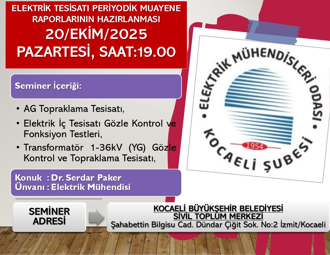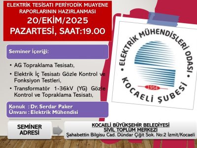 20 Ekim 2025 Pazartesi günü saat 19.00’da Kocaeli Büyükşehir Belediyesi Sivil Toplum Merkezinde “Elektrik Tesisatı Periyodik Muayene Raporlarının Hazırlanması Semineri” yüz yüze düzenlenecektir. Tüm Üyelerimizin katılımını dileriz.